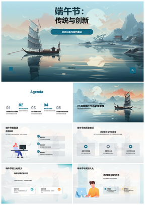 端午传统创新粽香龙舟焕新魅力PPT模板,端午传统创新粽香龙舟PPT模板,适配节日庆典,融合传统与现代设计,特色龙舟元素,焕发文化新魅力。