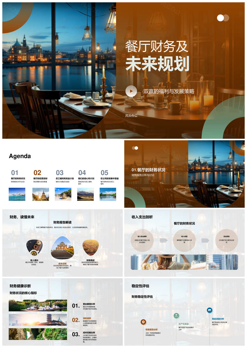 风云办公提供的餐厅财务健康评估与经营发展策略规划PPT模板,下载格式为pptx,一共32页,作品中文字及图均可以修改和编辑,图片更改请在作品中右键图片并更换,文字修改请直接点击文字进行修改。