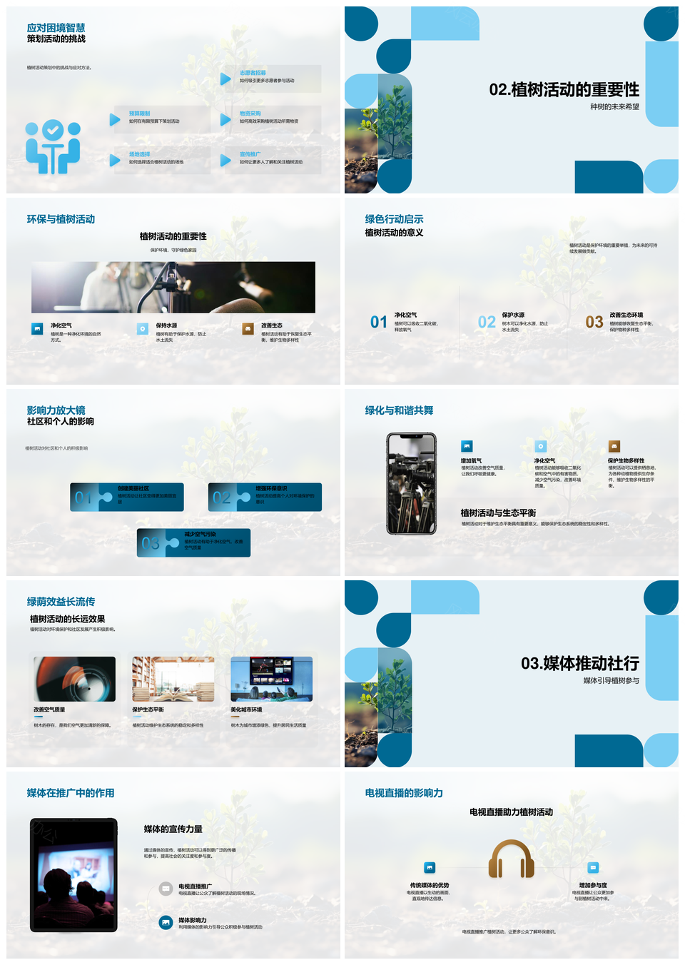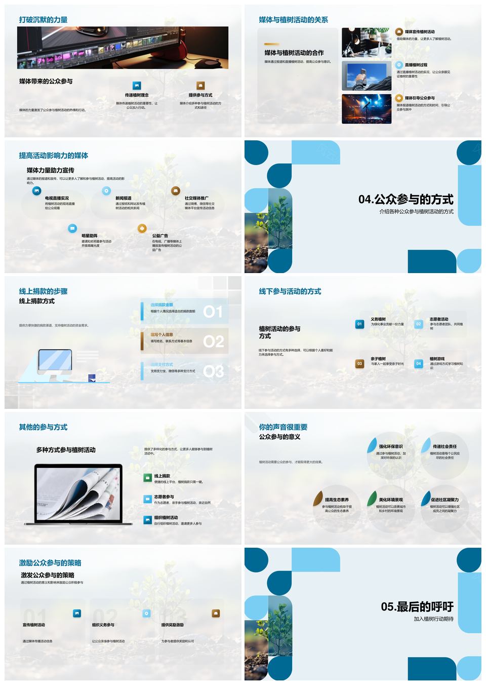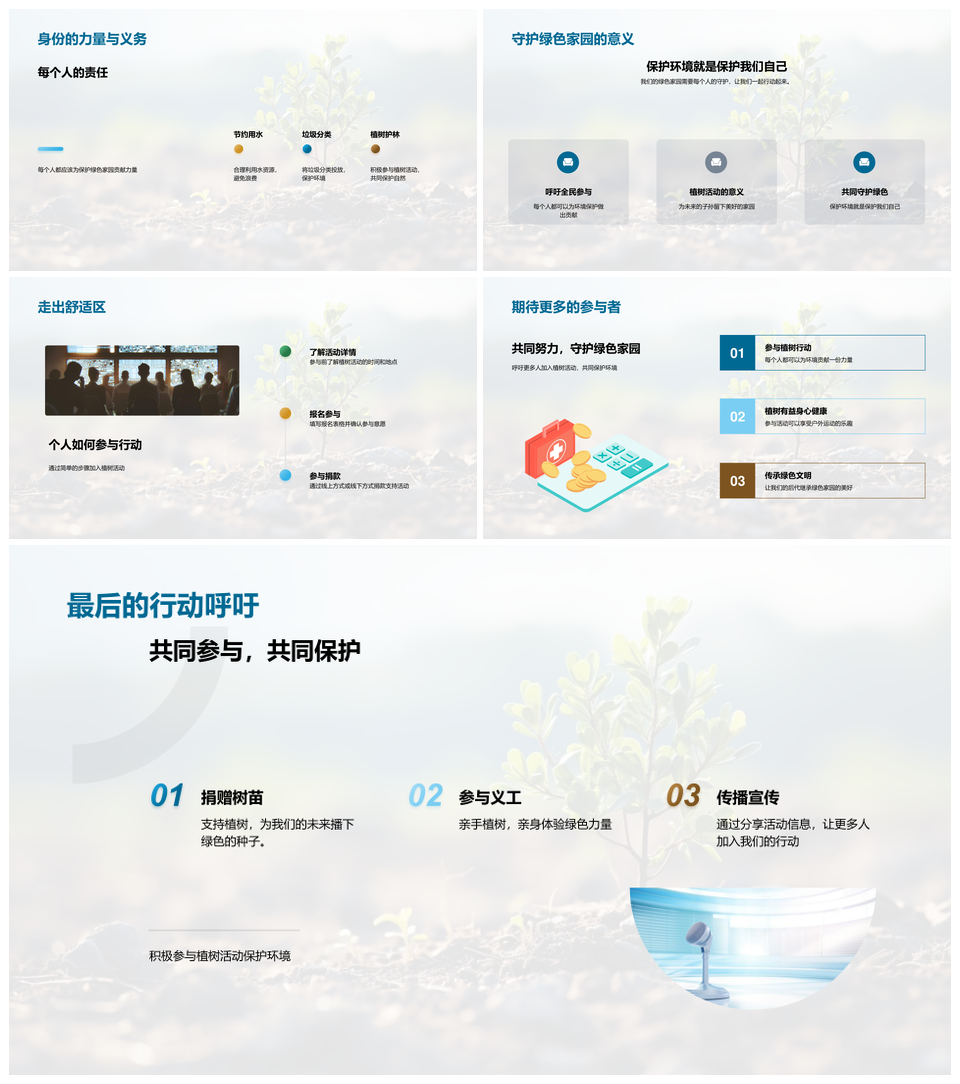 这是一张绿色行动植树直播公众捐树苗护生态传媒PPT模板,包含绿色行动、植树、直播、公众、捐树苗、护生态、传媒等主题内容,也可用作绿色行动植树直播、行动植树直播公众、植树直播公众捐树苗、直播公众捐树苗护生态、绿色行动植树、行动植树直播、植树直播公众、直播公众捐树苗、公众捐树苗护生态、绿色行动、行动植树、植树直播、直播公众、公众捐树苗、捐树苗护生态等PPT场景使用。 风云办公提供的绿色行动植树直播公众捐树苗护生态传媒PPT模板,下载格式为pptx,一共33页,作品中文字及图均可以修改和编辑,图片更改请在作品中右键图片并更换,文字修改请直接点击文字进行修改。