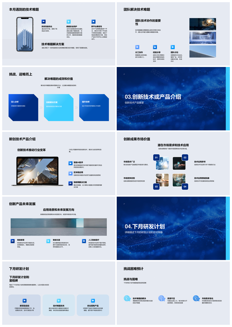 这是一张科技研发月度进展难题突破产品价值汇报PPT模板,包含科技、研发、月度、进展、难题、突破、产品、价值、汇报等主题内容,也可用作科技研发月度进展难题突破、月度进展难题突破、难题突破产品价值汇报、科技研发月度进展、月度进展难题、进展难题突破、难题突破产品价值、突破产品价值汇报、月度进展、进展难题、难题突破、突破产品价值、产品价值汇报、科技研发月度进展难题、月度进展难题突破产品价值等PPT场景使用。 风云办公提供的科技研发月度进展难题突破产品价值汇报PPT模板,下载格式为pptx,一共23页,作品中文字及图均可以修改和编辑,图片更改请在作品中右键图片并更换,文字修改请直接点击文字进行修改。