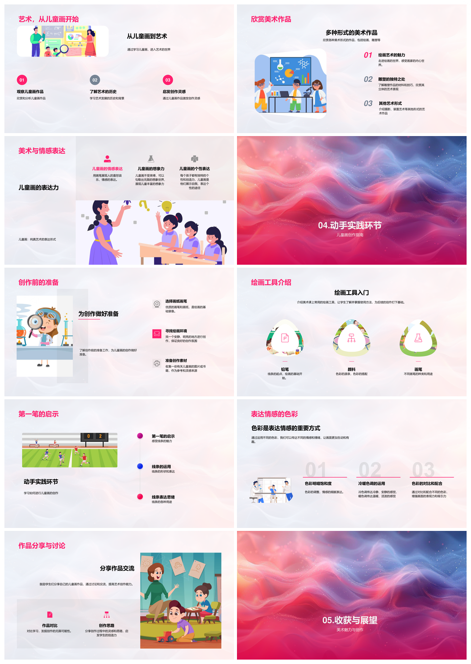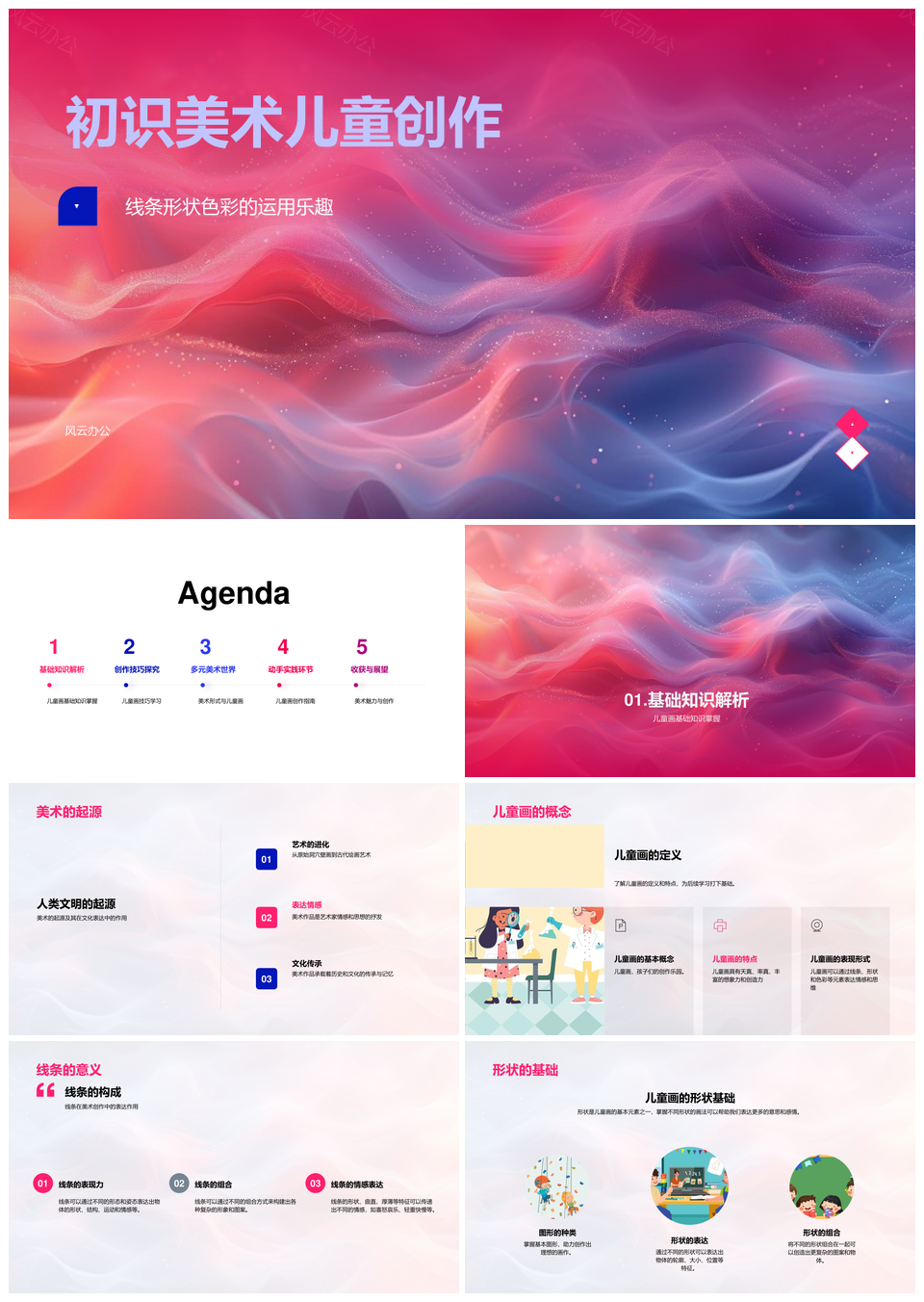 风云办公提供的美术儿童创作基础线条色彩形状入门PPT模板,下载格式为pptx,一共33页,作品中文字及图均可以修改和编辑,图片更改请在作品中右键图片并更换,文字修改请直接点击文字进行修改。