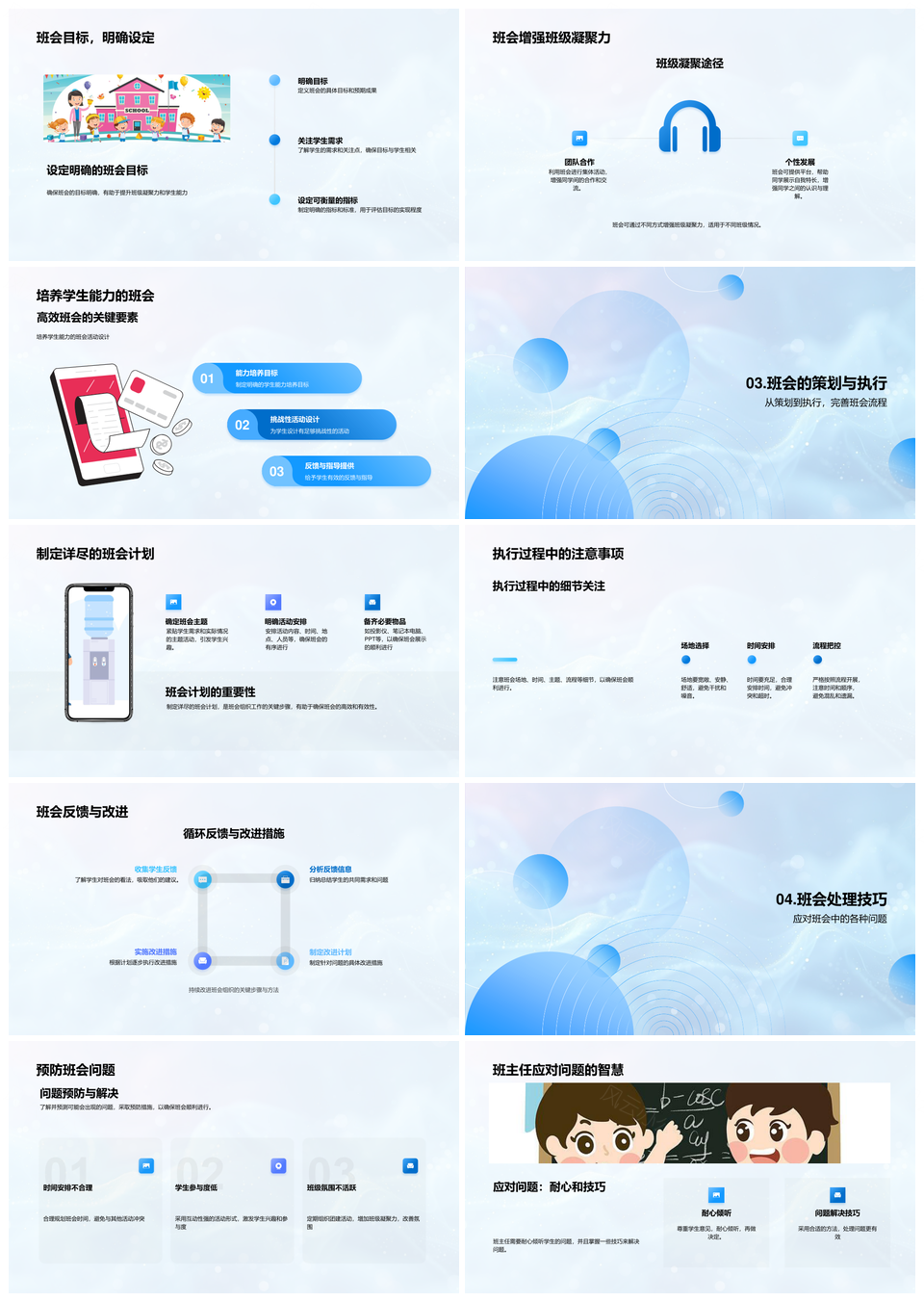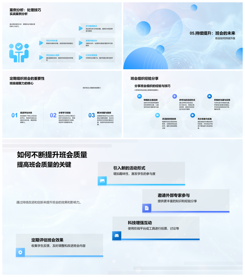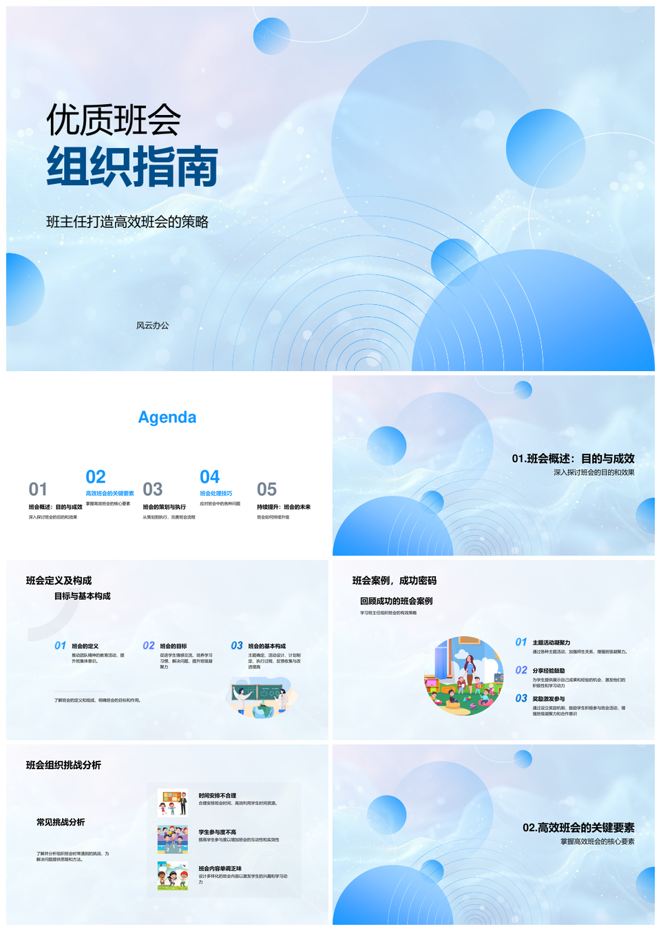 风云办公提供的班主任高效优质班会组织策略指南PPT模板,下载格式为pptx,一共23页,作品中文字及图均可以修改和编辑,图片更改请在作品中右键图片并更换,文字修改请直接点击文字进行修改。
