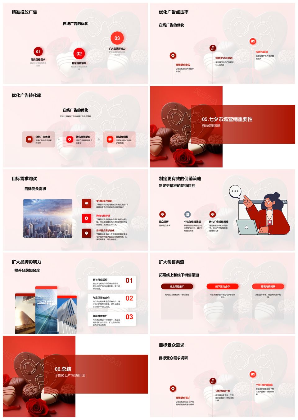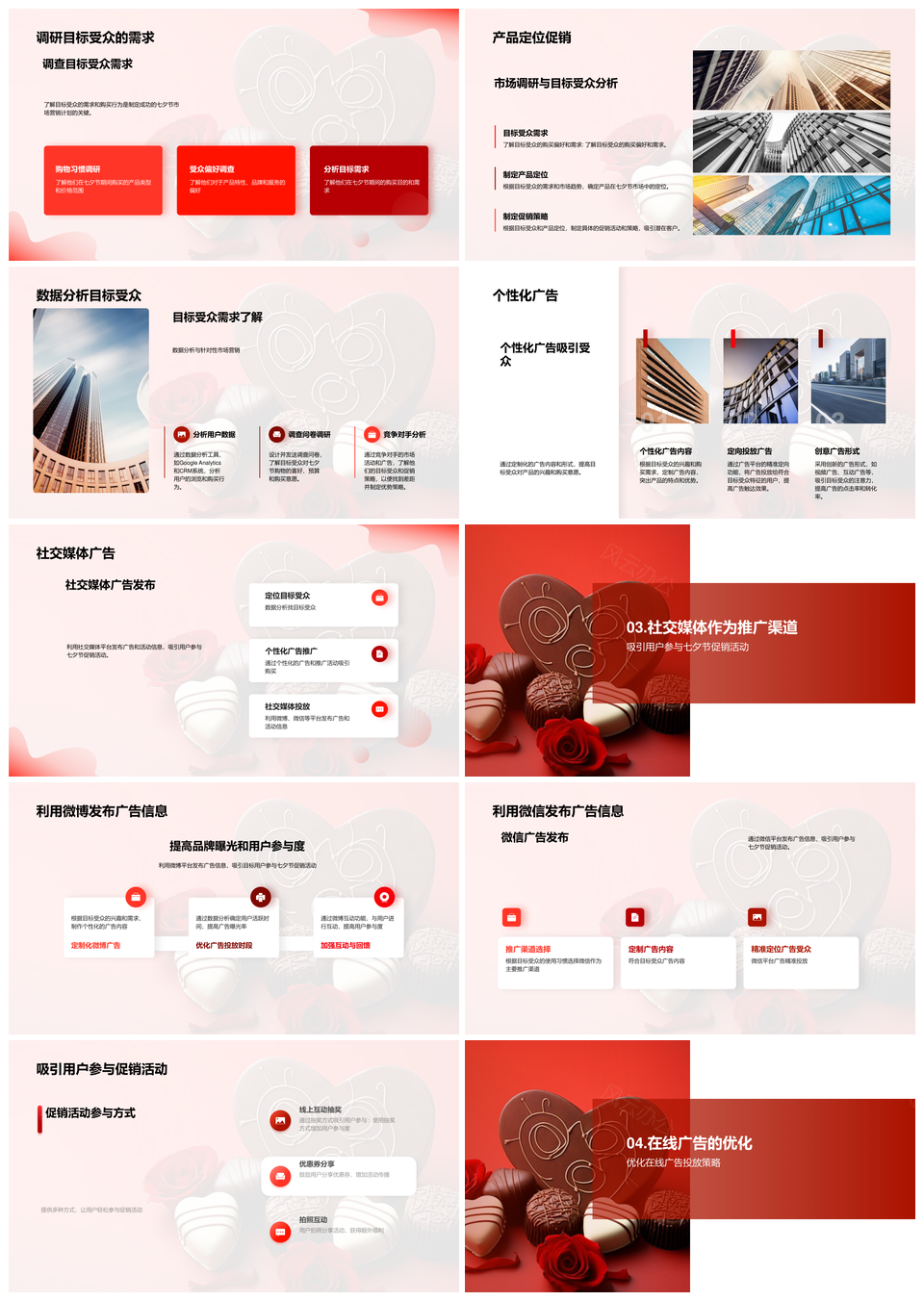 这是一张七夕电商心形巧克力营销策划产品定位促销策略目标受众数据分析PPT模板,包含七夕、电商、心形、巧克力、营销、策划、产品、定位、促销、策略、目标、受众、数据、分析等主题内容,也可用作七夕电商心形巧克力营销策划、电商心形巧克力促销策略目标受众、产品定位促销策略目标受众数据分析、七夕电商目标受众数据分析、七夕心形巧克力促销策略、电商营销策划数据分析、产品定位促销策略目标受众、促销策略目标受众数据分析、产品定位目标受众、营销策划促销策略、七夕电商营销策划、心形巧克力促销策略、电商数据分析、目标受众数据分析、产品定位促销策略等PPT场景使用。 风云办公提供的七夕电商心形巧克力营销策划产品定位促销策略目标受众数据分析PPT模板,下载格式为pptx,一共31页,作品中文字及图均可以修改和编辑,图片更改请在作品中右键图片并更换,文字修改请直接点击文字进行修改。