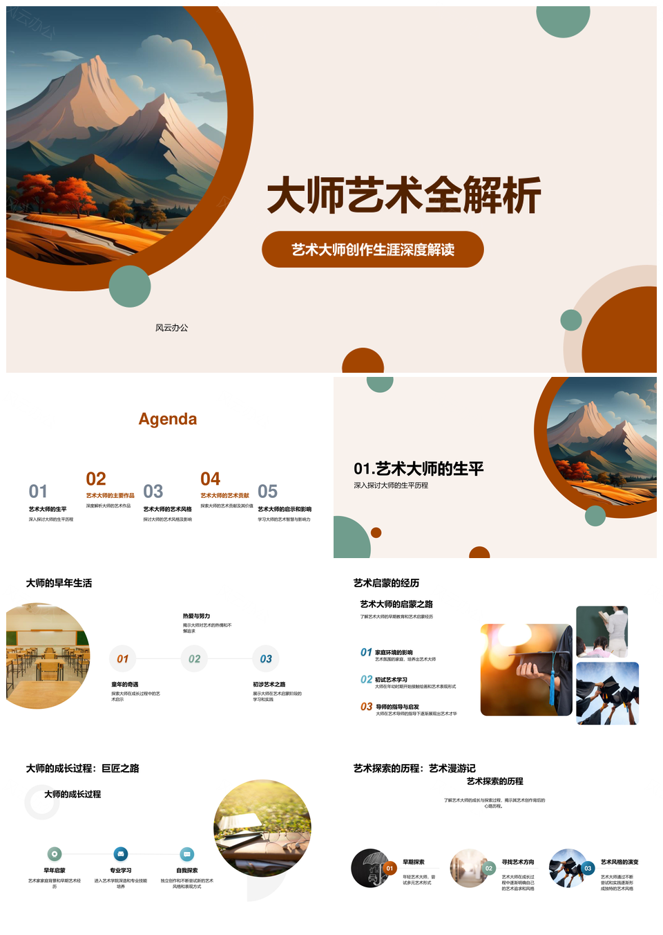这是一张艺术大师创作启蒙探索代表作品风格解析PPT模板,包含艺术大师、创作、启蒙、探索、代表、作品、风格、解析等主题内容,也可用作艺术大师创作启蒙探索、艺术大师探索代表作品风格解析、创作启蒙探索代表作品、启蒙探索代表作品风格解析、艺术大师创作代表作品、代表作品风格解析艺术大师、艺术大师创作启蒙、艺术大师代表作品风格解析、创作启蒙代表作品风格、启蒙探索风格解析、探索代表作品风格解析、艺术大师探索启蒙、创作代表作品风格解析、艺术大师风格解析、启蒙代表作品创作等PPT场景使用。 风云办公提供的艺术大师创作启蒙探索代表作品风格解析PPT模板,下载格式为pptx,一共28页,作品中文字及图均可以修改和编辑,图片更改请在作品中右键图片并更换,文字修改请直接点击文字进行修改。