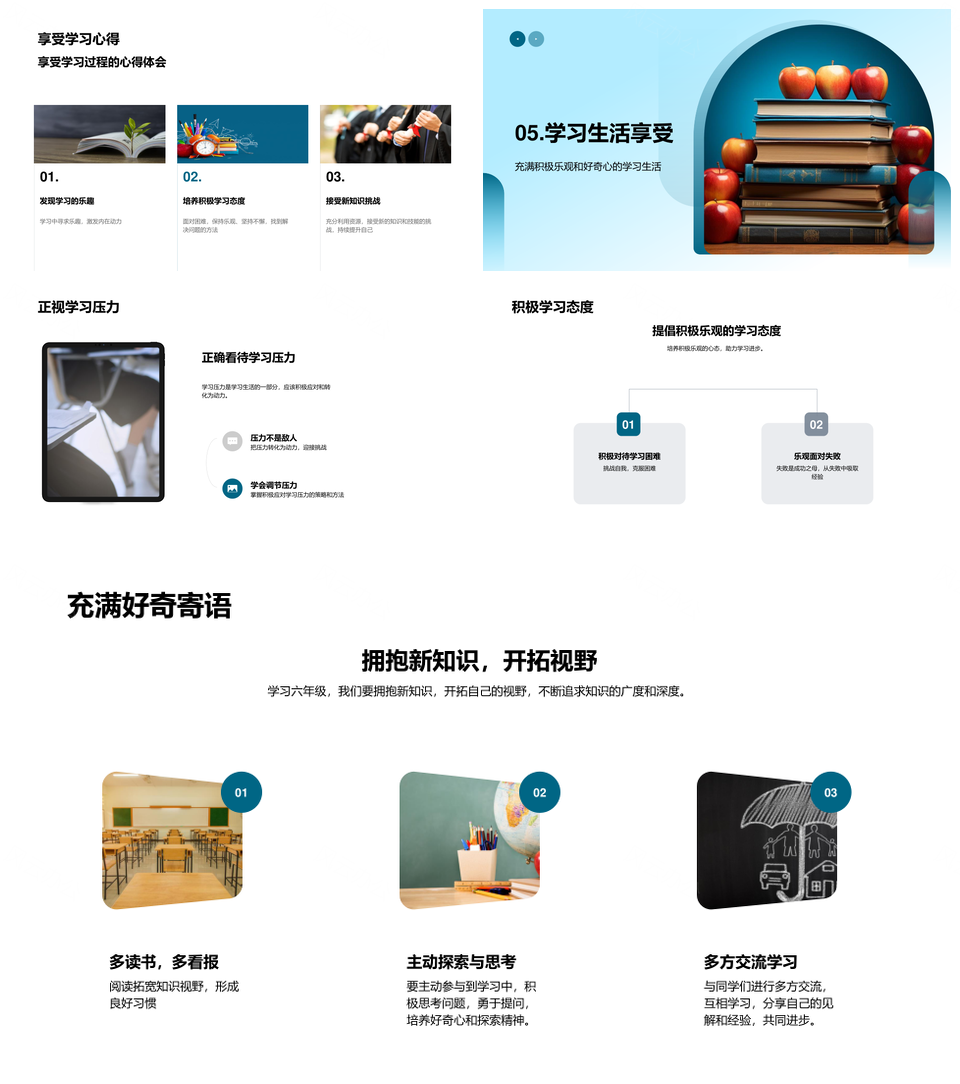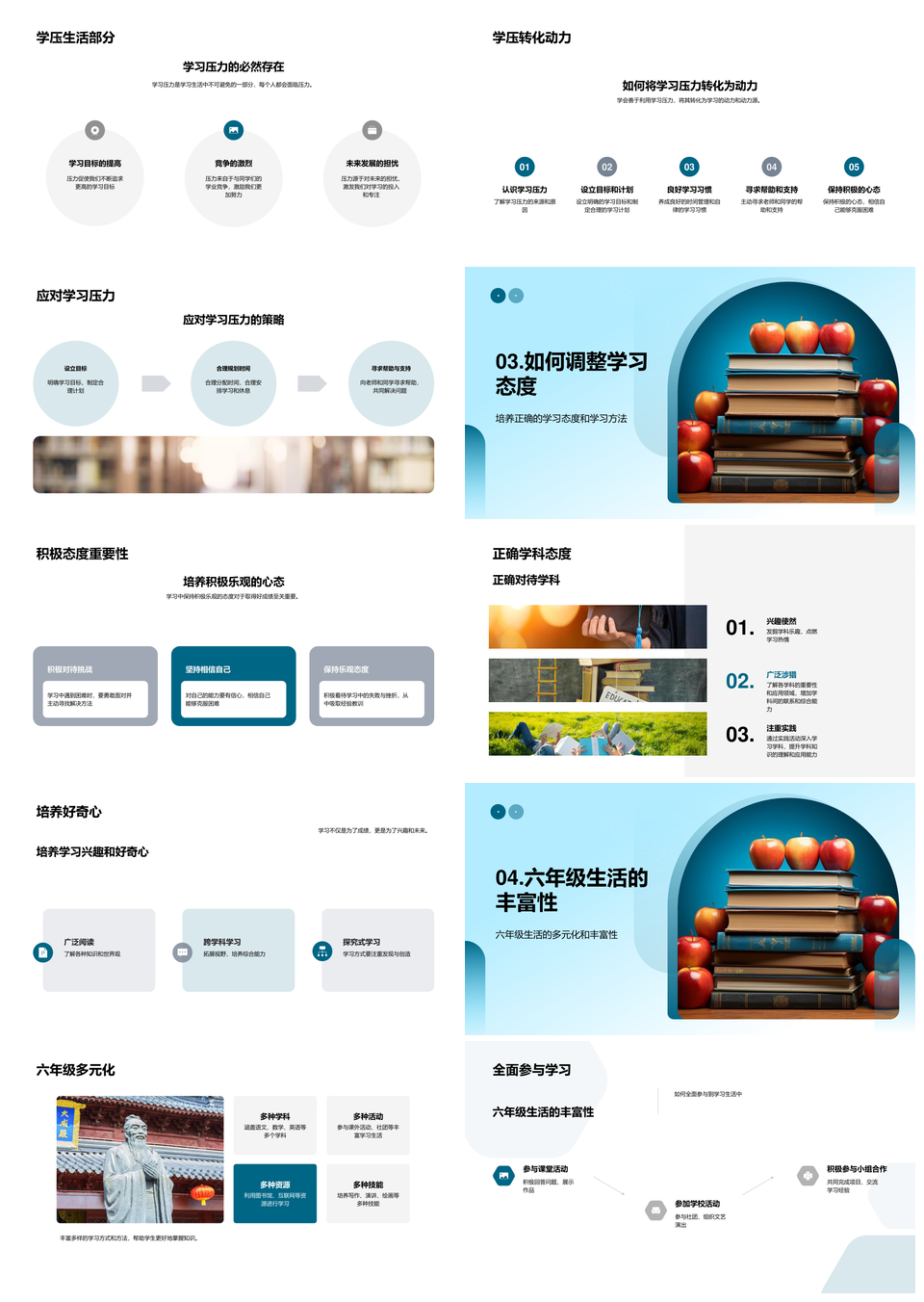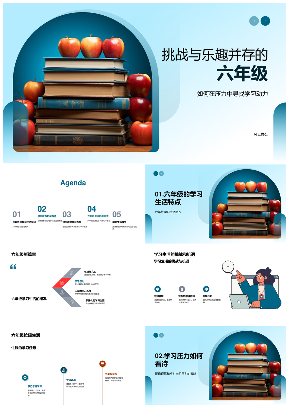 风云办公提供的六年级学习压力动力一堆书PPT模板,下载格式为pptx,一共23页,作品中文字及图均可以修改和编辑,图片更改请在作品中右键图片并更换,文字修改请直接点击文字进行修改。