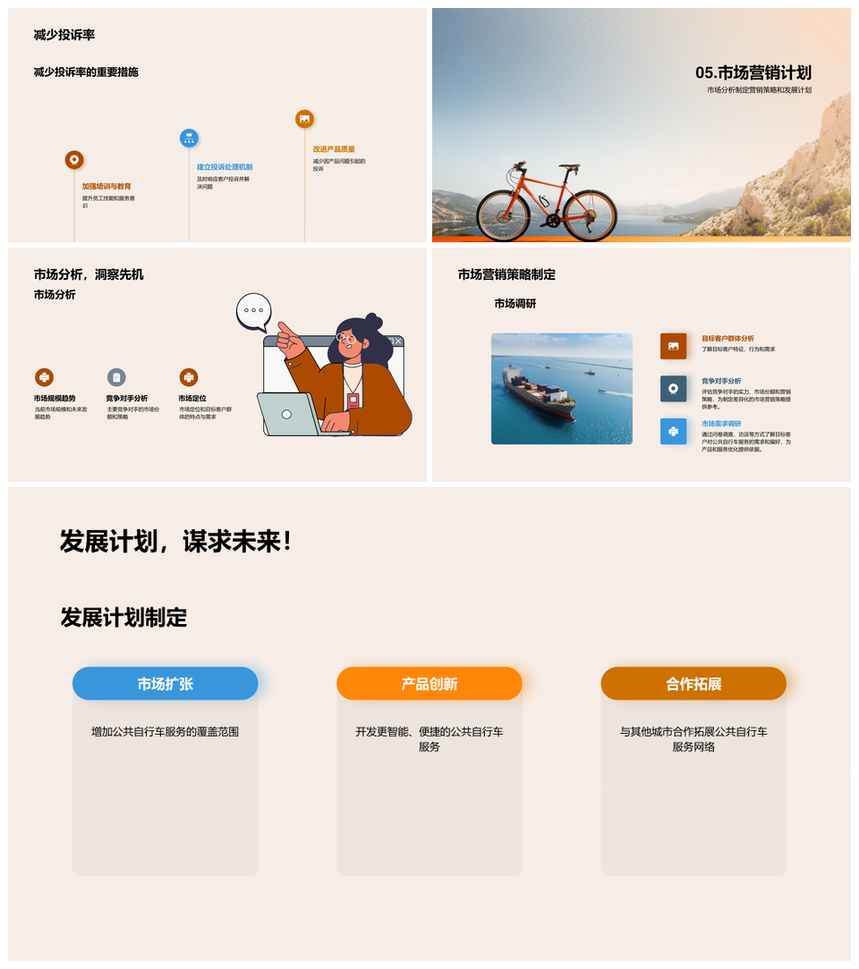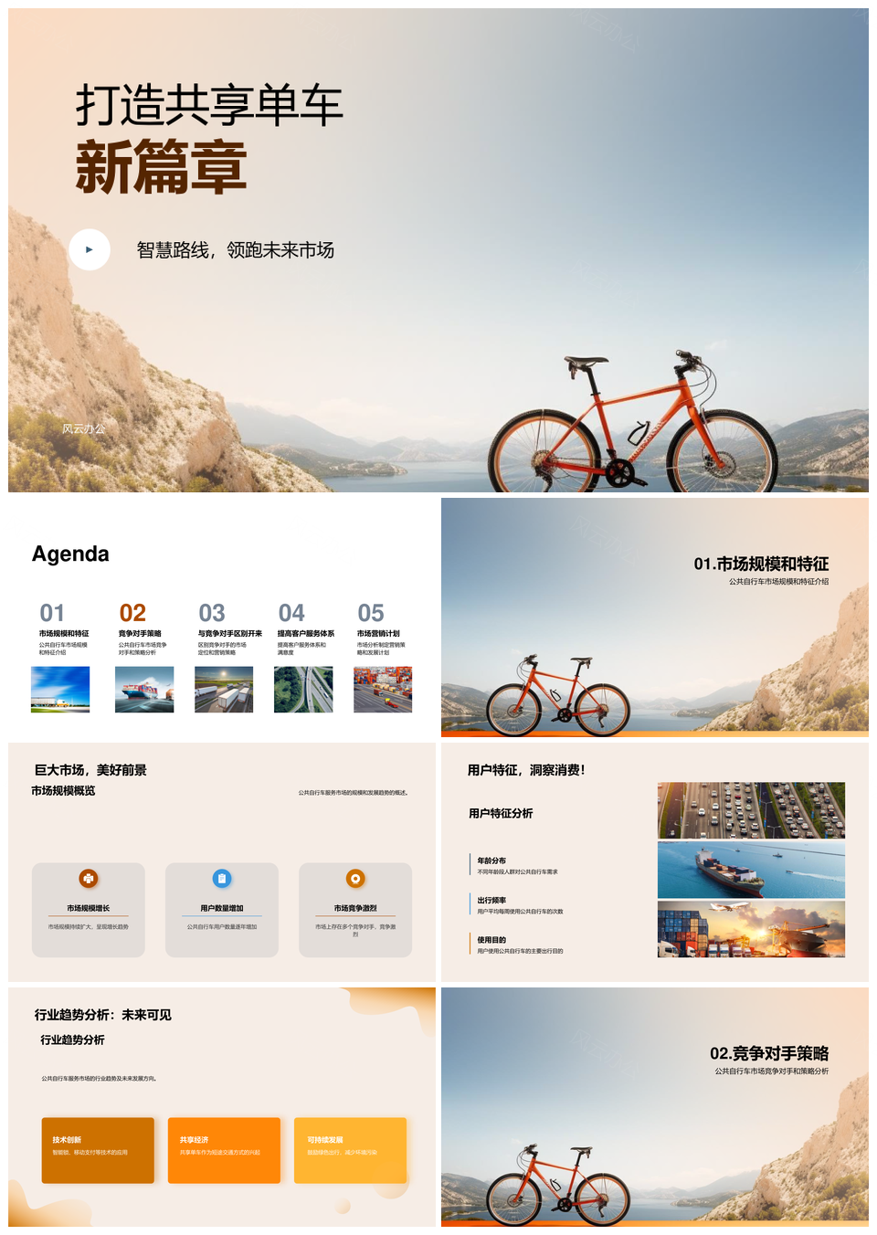 风云办公提供的共享单车市场分析趋势竞争策略新篇章PPT模板,下载格式为pptx,一共23页,作品中文字及图均可以修改和编辑,图片更改请在作品中右键图片并更换,文字修改请直接点击文字进行修改。
