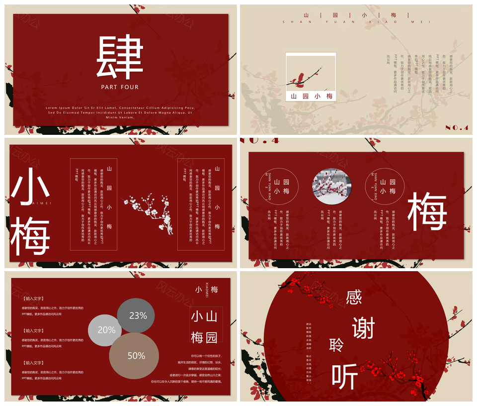这是一张红色山园小梅大气中国风年终总结计划汇报通用PPT模板,包含红色、山园、小梅、大气、中国风、年终总结、计划、汇报等主题内容,也可用作红色山园小梅大气、山园小梅大气中国风、小梅大气中国风年终总结、大气中国风年终总结计划、中国风年终总结计划汇报、年终总结计划汇报通用、大气中国风年终总结、中国风年终总结计划、年终总结计划汇报、计划汇报通用、红色山园、山园小梅、小梅大气、大气中国风、中国风年终总结、年终总结计划、计划汇报、汇报通用等PPT场景使用。 风云办公提供的红色山园小梅大气中国风年终总结计划汇报通用PPT模板,下载格式为pptx,一共23页,作品中文字及图均可以修改和编辑,图片更改请在作品中右键图片并更换,文字修改请直接点击文字进行修改。