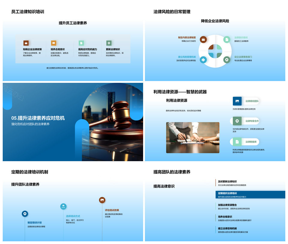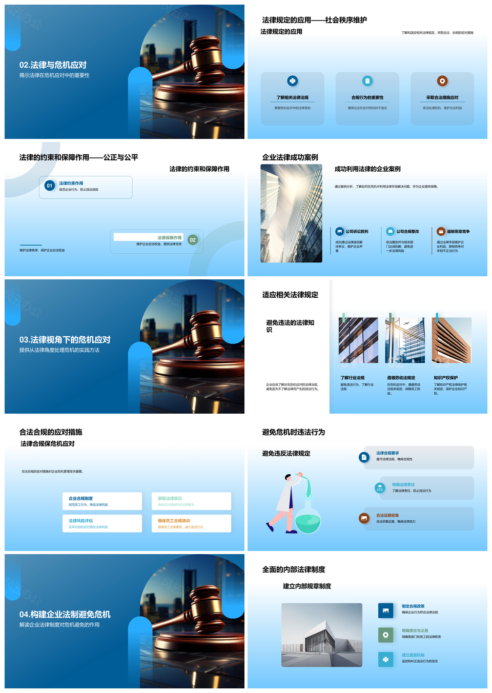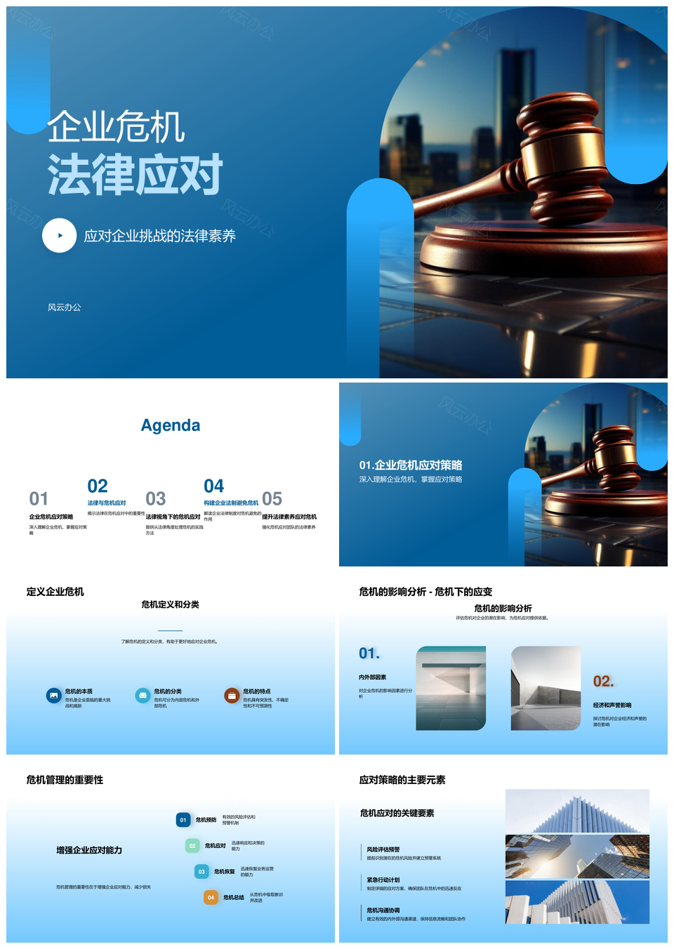 风云办公提供的企业危机法律应对策略合规法槌管理PPT模板,下载格式为pptx,一共24页,作品中文字及图均可以修改和编辑,图片更改请在作品中右键图片并更换,文字修改请直接点击文字进行修改。