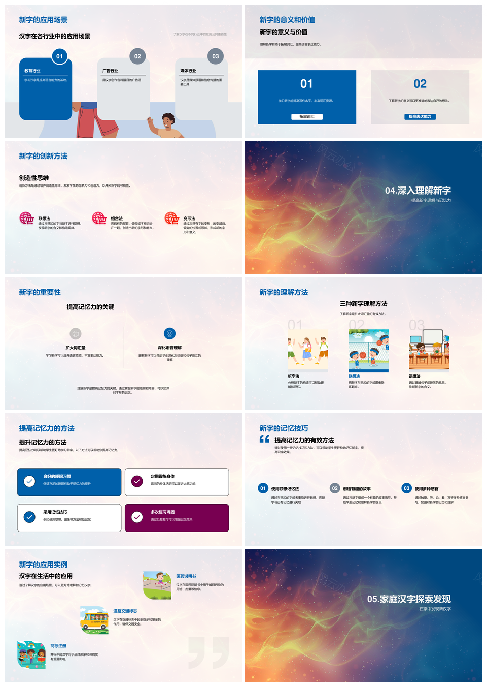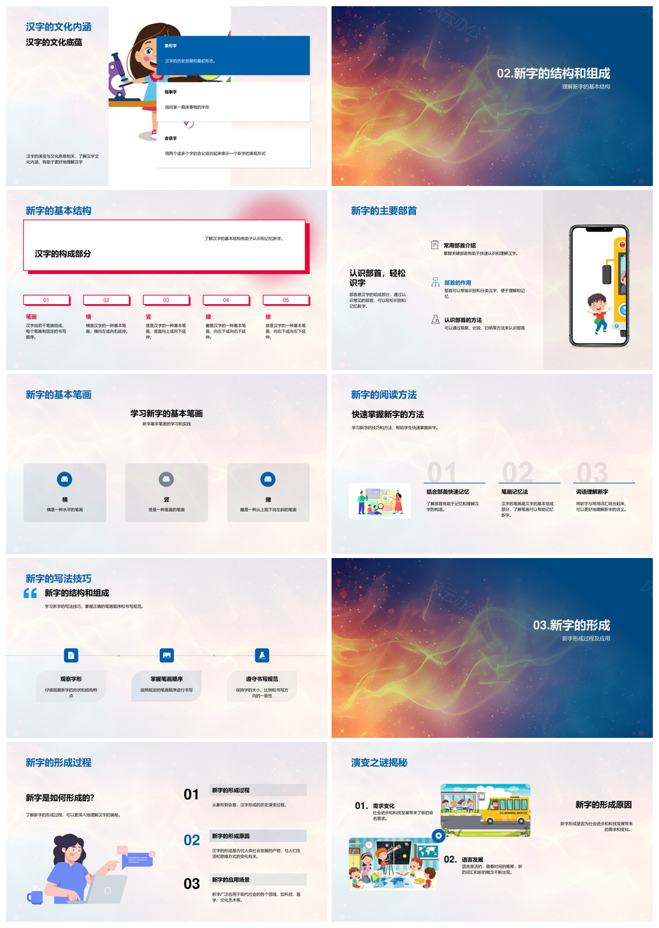 这是一张小学生汉字起源演变结构笔画部首现代应用形成过程PPT模板,包含汉字起源、演变、结构、笔画、部首、现代应用、形成过程等主题内容,也可用作小学生汉字起源演变结构、汉字起源演变结构笔画、起源演变结构笔画部首、演变结构笔画部首现代应用、结构笔画部首现代应用形成过程、小学生汉字结构笔画部首、汉字结构笔画现代应用、笔画部首现代应用形成过程、演变结构现代应用形成过程、结构部首现代应用形成过程、汉字演变现代应用形成过程、小学生演变结构笔画、起源笔画现代应用形成、结构笔画形成过程、汉字部首现代应用等PPT场景使用。 风云办公提供的小学生汉字起源演变结构笔画部首现代应用形成过程PPT模板,下载格式为pptx,一共33页,作品中文字及图均可以修改和编辑,图片更改请在作品中右键图片并更换,文字修改请直接点击文字进行修改。