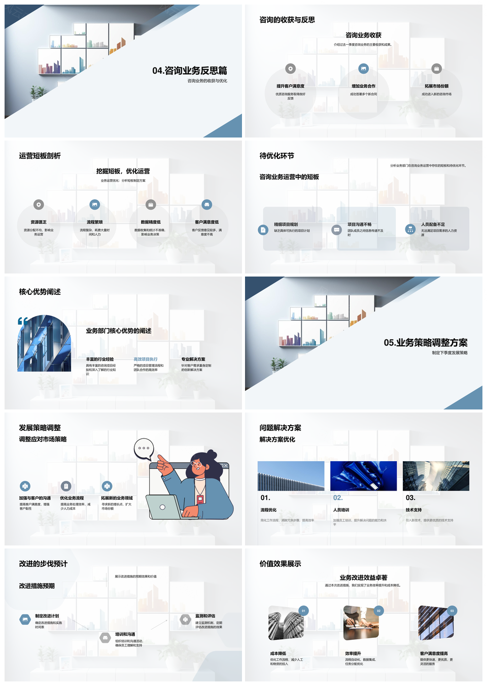 这是一张咨询业务策略调整一季度回顾项目举措挑战方案展望图表PPT模板,包含咨询、业务策略、调整、一季度、回顾、项目、举措、挑战、方案、展望、图表等主题内容,也可用作咨询业务策略调整一季度回顾、策略调整一季度回顾项目、一季度回顾项目举措挑战、咨询业务策略调整展望、策略调整项目举措挑战、一季度回顾挑战方案展望、咨询业务项目举措挑战方案、策略调整挑战方案展望图表、咨询业务策略调整方案、一季度回顾举措挑战方案、项目举措挑战方案展望、咨询业务展望图表、策略调整项目举措、一季度挑战方案展望、项目举措展望图表等PPT场景使用。 风云办公提供的咨询业务策略调整一季度回顾项目举措挑战方案展望图表PPT模板,下载格式为pptx,一共28页,作品中文字及图均可以修改和编辑,图片更改请在作品中右键图片并更换,文字修改请直接点击文字进行修改。