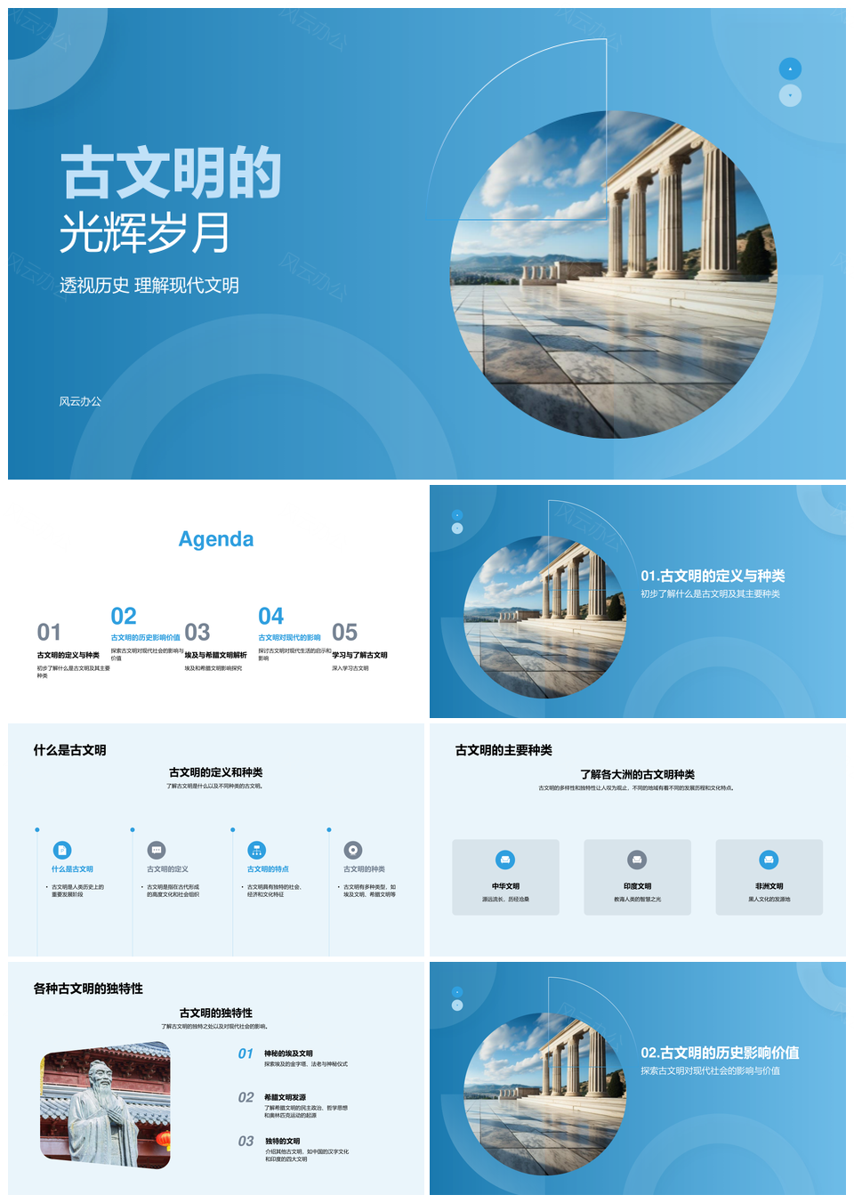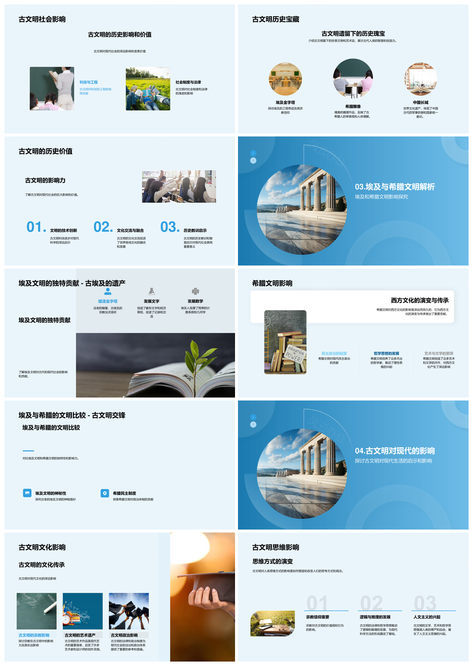 风云办公提供的埃及希腊古文明历史影响现代价值比较PPT模板,下载格式为pptx,一共23页,作品中文字及图均可以修改和编辑,图片更改请在作品中右键图片并更换,文字修改请直接点击文字进行修改。
