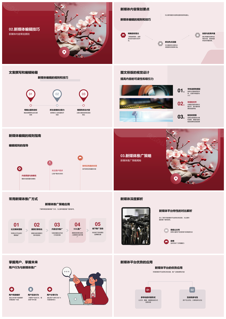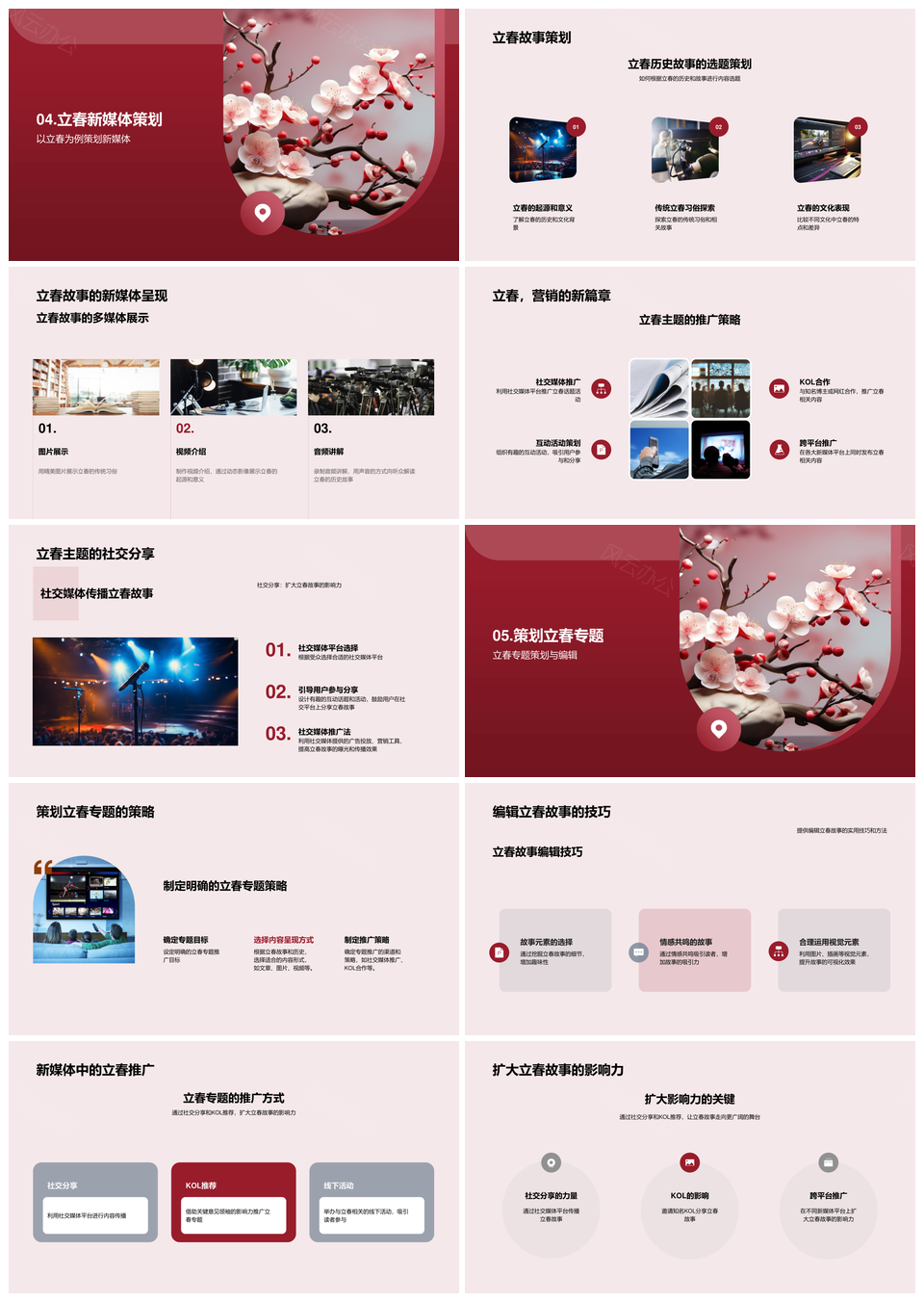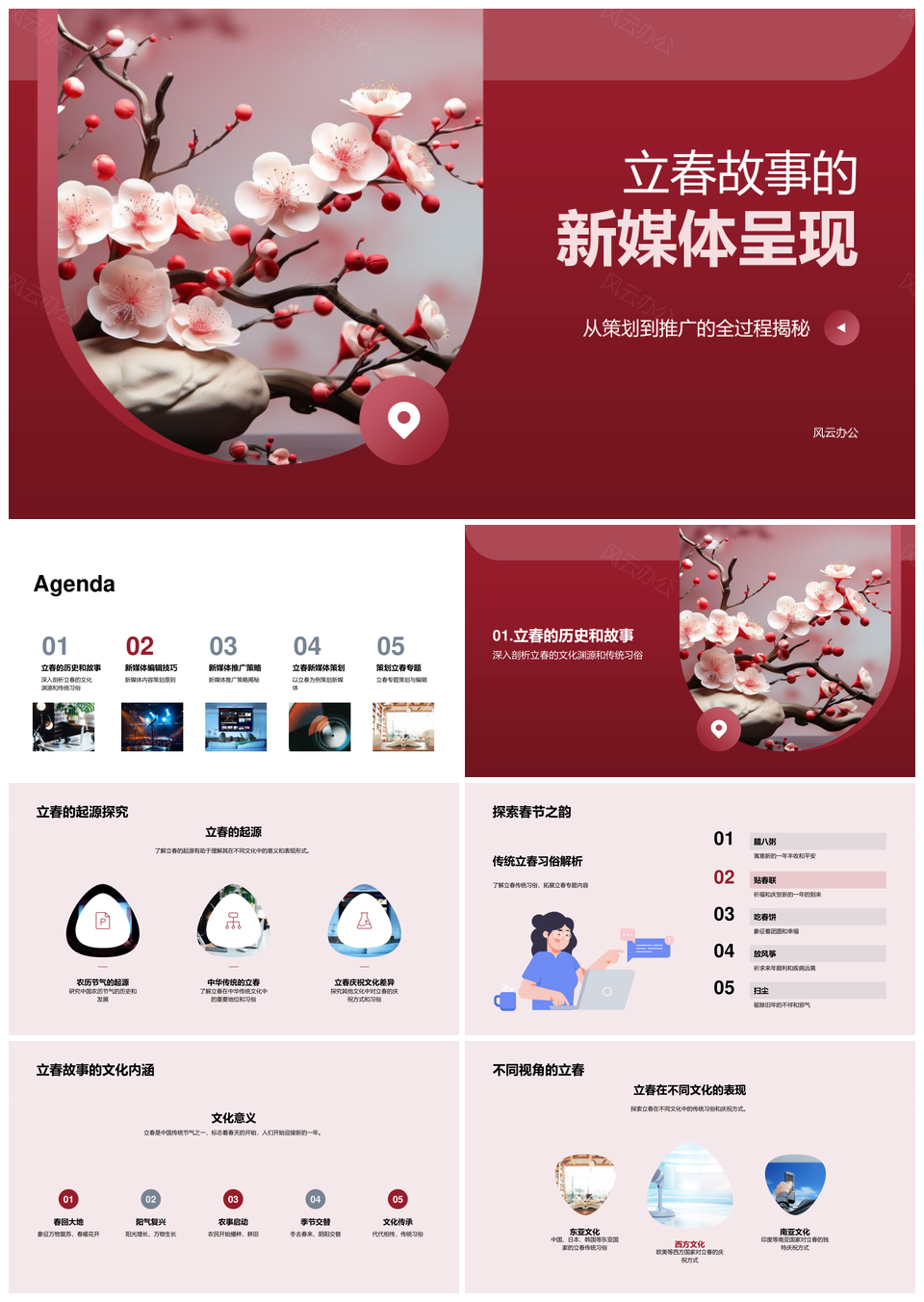 风云办公提供的立春樱花新媒体策划视觉推广设计PPT模板,下载格式为pptx,一共28页,作品中文字及图均可以修改和编辑,图片更改请在作品中右键图片并更换,文字修改请直接点击文字进行修改。