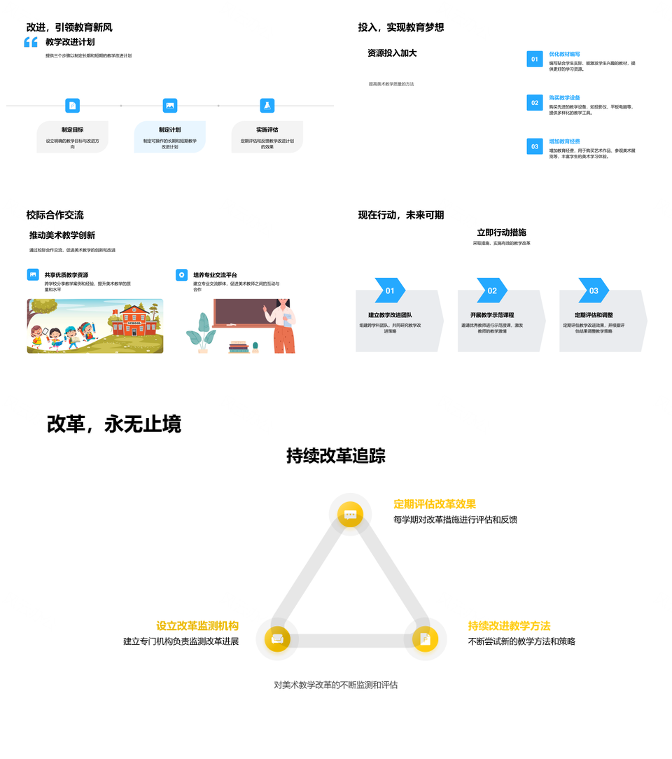 本模板专为美术教育机构及文化创意公司设计,以专业视角呈现教学成果与业务发展。聚焦美术教学质量提升路径,通过创新实践案例、传统文化传承策略、学员创造力培养方法三大模块,系统梳理核心工作成果。左侧设置教学成果数据看板,可清晰展示用户增长、课程转化率及盈利提升情况,右侧配置可视化图表区,支持插入学员作品对比、项目周期进度及行业趋势分析。全稿采用低饱和度配色搭配手绘线条素材,兼顾艺术质感与商务调性,支持快速修改企业VI元素,适用于年度总结汇报、项目成果展示及行业论坛交流场景。