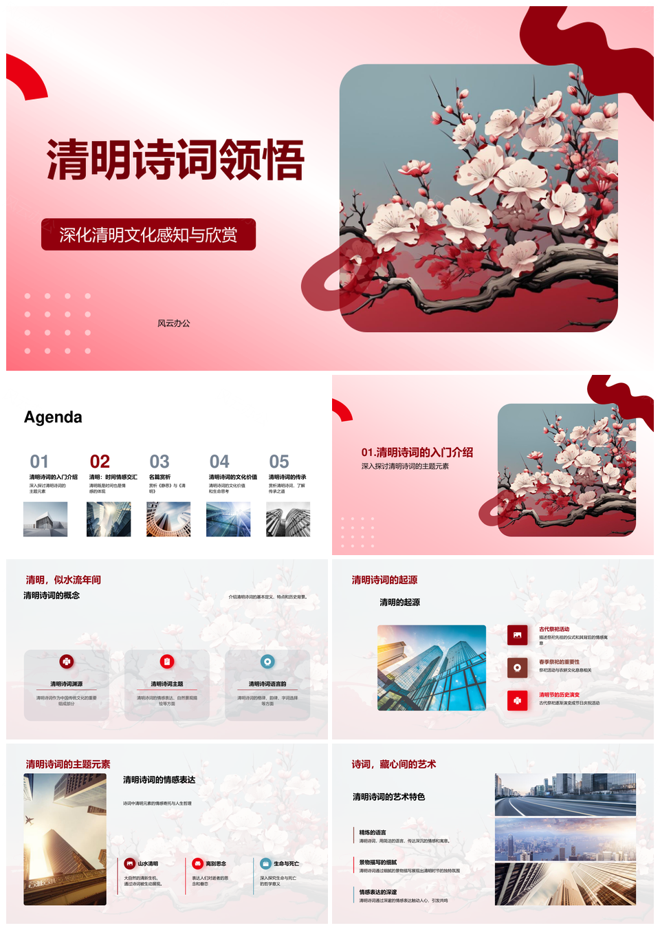风云办公提供的清明诗词樱花树文化情感艺术特色PPT模板,下载格式为pptx,一共33页,作品中文字及图均可以修改和编辑,图片更改请在作品中右键图片并更换,文字修改请直接点击文字进行修改。