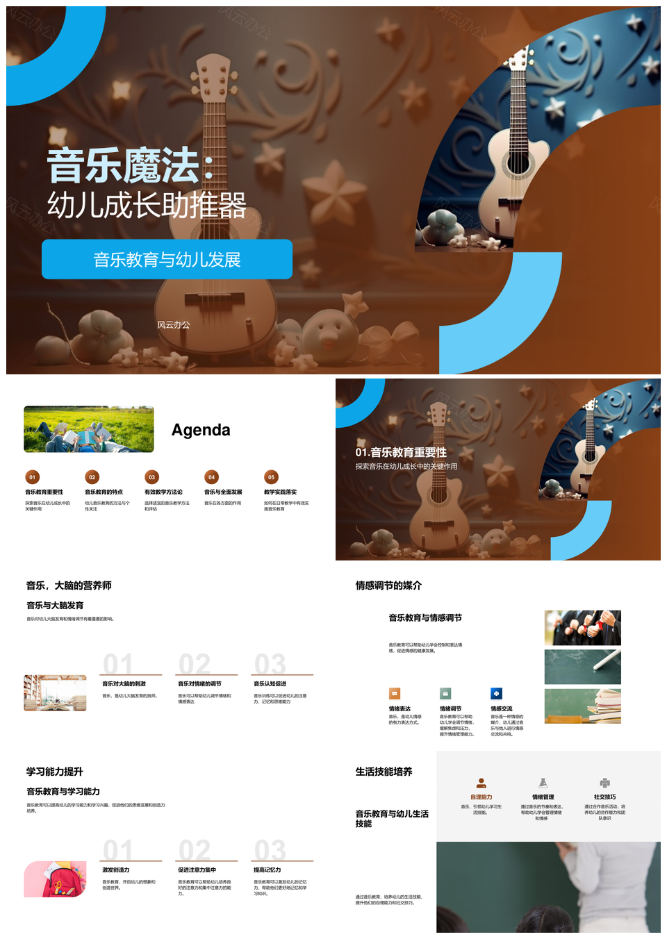 风云办公提供的音乐教育助力幼儿脑力情感技能发展PPT模板,下载格式为pptx,一共30页,作品中文字及图均可以修改和编辑,图片更改请在作品中右键图片并更换,文字修改请直接点击文字进行修改。