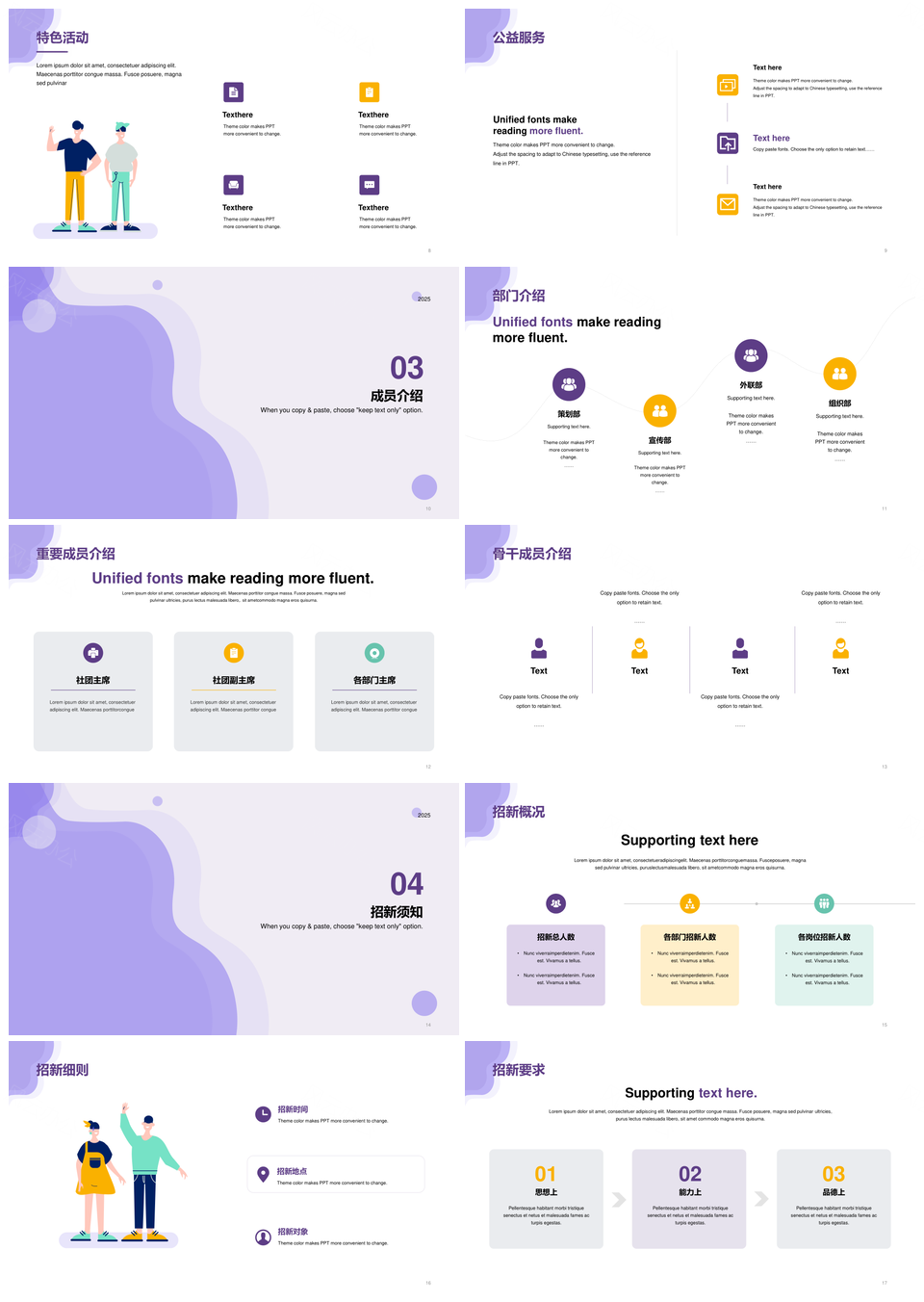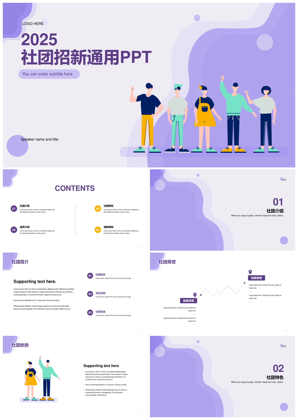 2025紫色插画教育培训学生社团招新PPT模板推荐