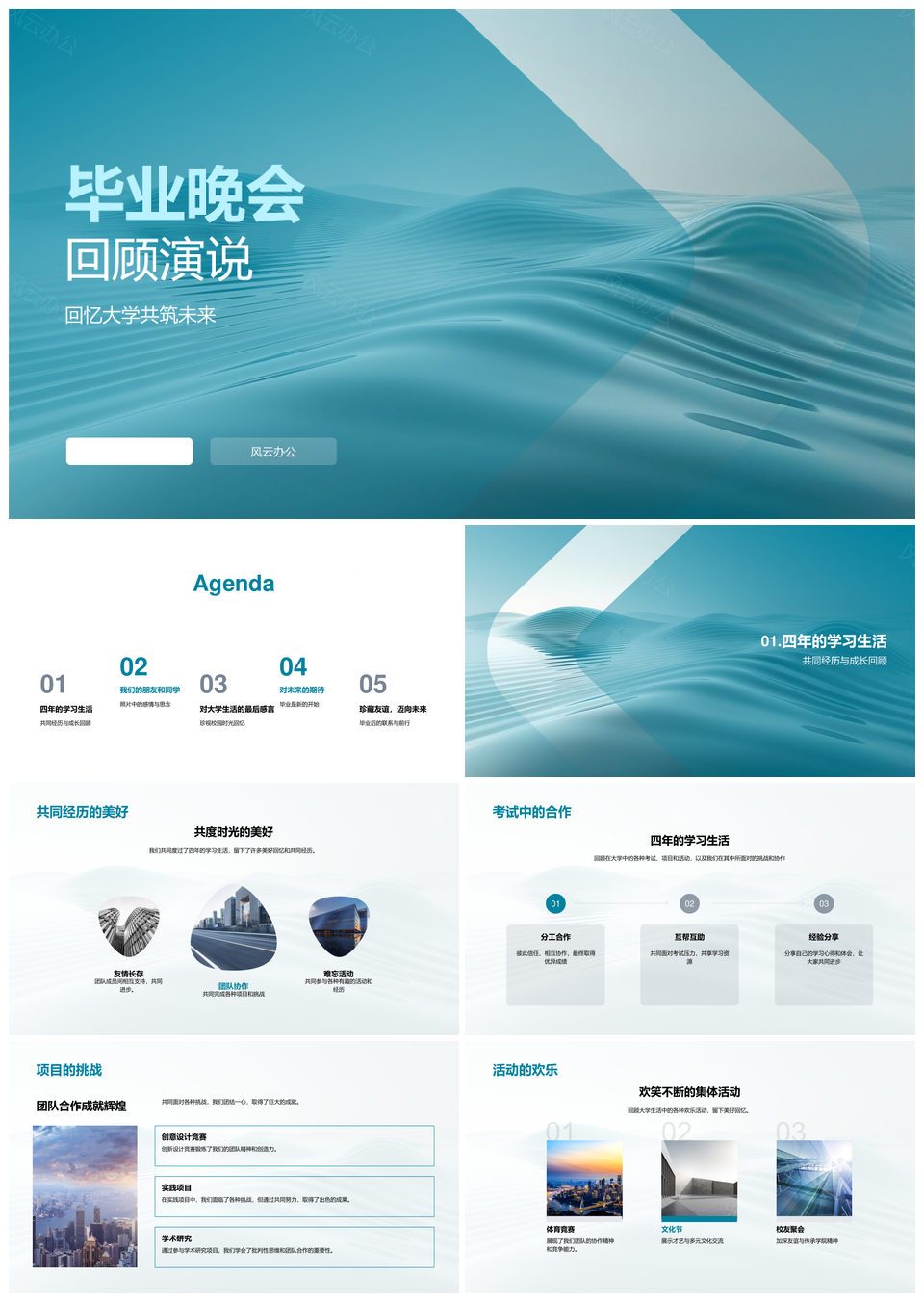 风云办公提供的毕业晚会大学友谊共同成长未来挑战PPT模板,下载格式为pptx,一共33页,作品中文字及图均可以修改和编辑,图片更改请在作品中右键图片并更换,文字修改请直接点击文字进行修改。