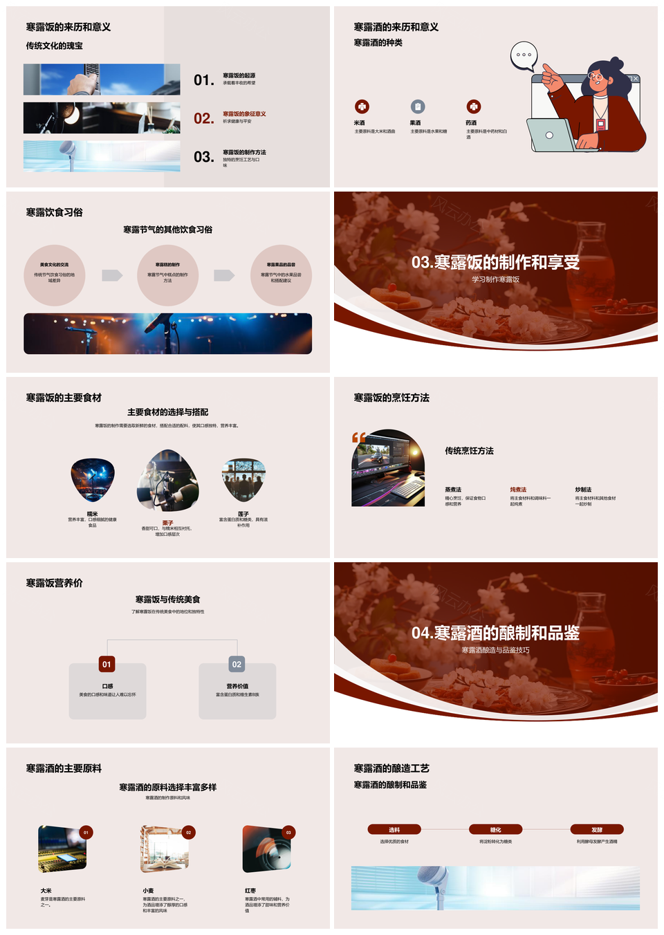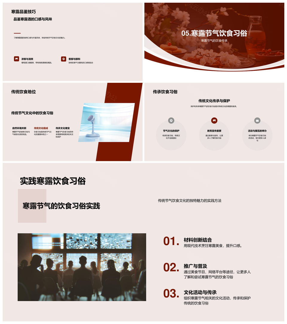 这是一张寒露饮食文化节气习俗饭酒烹饪营养PPT模板,包含寒露、饮食文化、节气习俗、饭酒、烹饪、营养等主题内容,也可用作寒露饮食文化节气、饮食文化节气习俗、文化节气习俗饭酒、节气习俗饭酒烹饪、习俗饭酒烹饪营养、寒露饮食文化、饮食文化节气、文化节气习俗、节气习俗饭酒、习俗饭酒烹饪、饭酒烹饪营养、寒露饮食、饮食文化、文化节气、节气习俗等PPT场景使用。