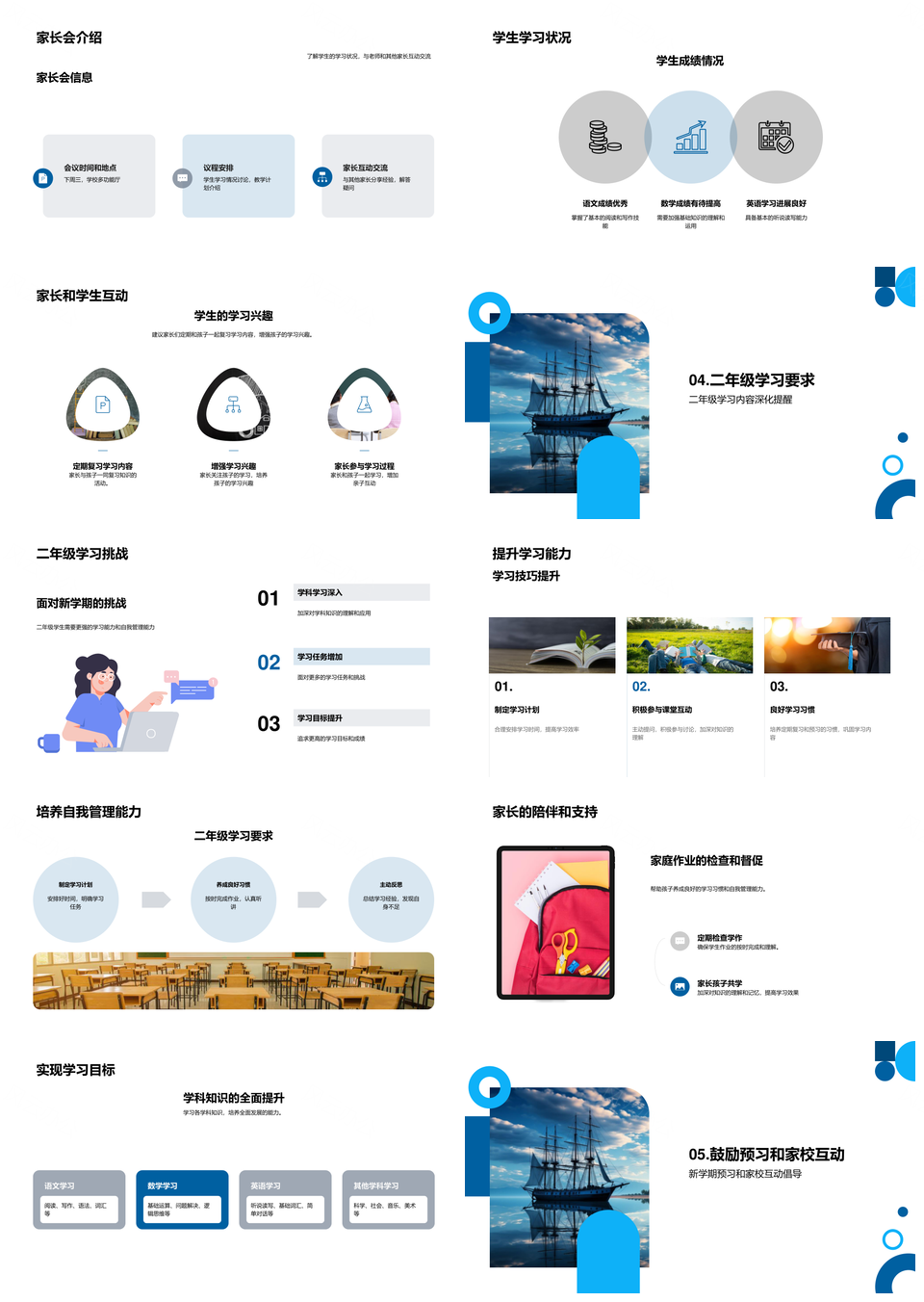 这是一张二年级新征程师生家共启新知好习惯助全面发展PPT模板,包含二年级、新征程、师生家、共启、新知、好习惯、全面发展等主题内容,也可用作二年级新征程师生共启、新征程师生共启新知、师生共启新知好习惯、共启新知好习惯全面发展、二年级师生共启新知、新征程共启好习惯助、新知好习惯助全面发展、二年级共启全面发展、新征程好习惯助成长、师生共启好习惯、共启新知助发展、二年级新征程全面发展、师生共启好习惯、新知助全面发展、好习惯助发展等PPT场景使用。 风云办公提供的二年级新征程师生家共启新知好习惯助全面发展PPT模板,下载格式为pptx,一共33页,作品中文字及图均可以修改和编辑,图片更改请在作品中右键图片并更换,文字修改请直接点击文字进行修改。