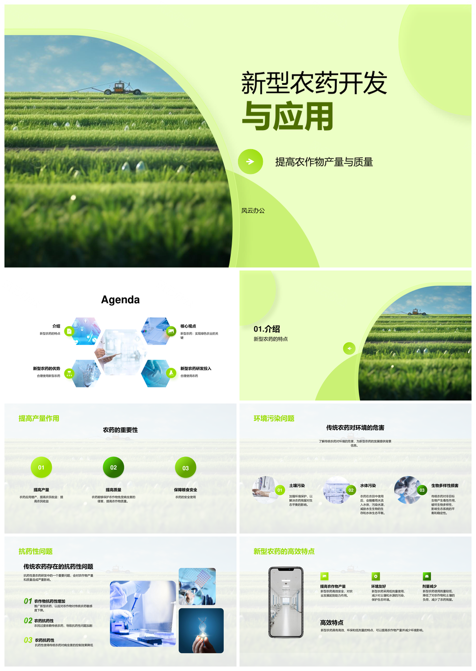 风云办公提供的新型农药高效环保助力农田提质增产PPT模板,下载格式为pptx,一共20页,作品中文字及图均可以修改和编辑,图片更改请在作品中右键图片并更换,文字修改请直接点击文字进行修改。