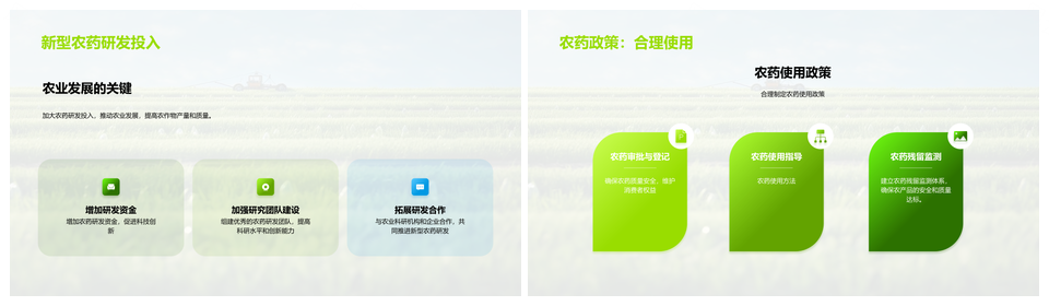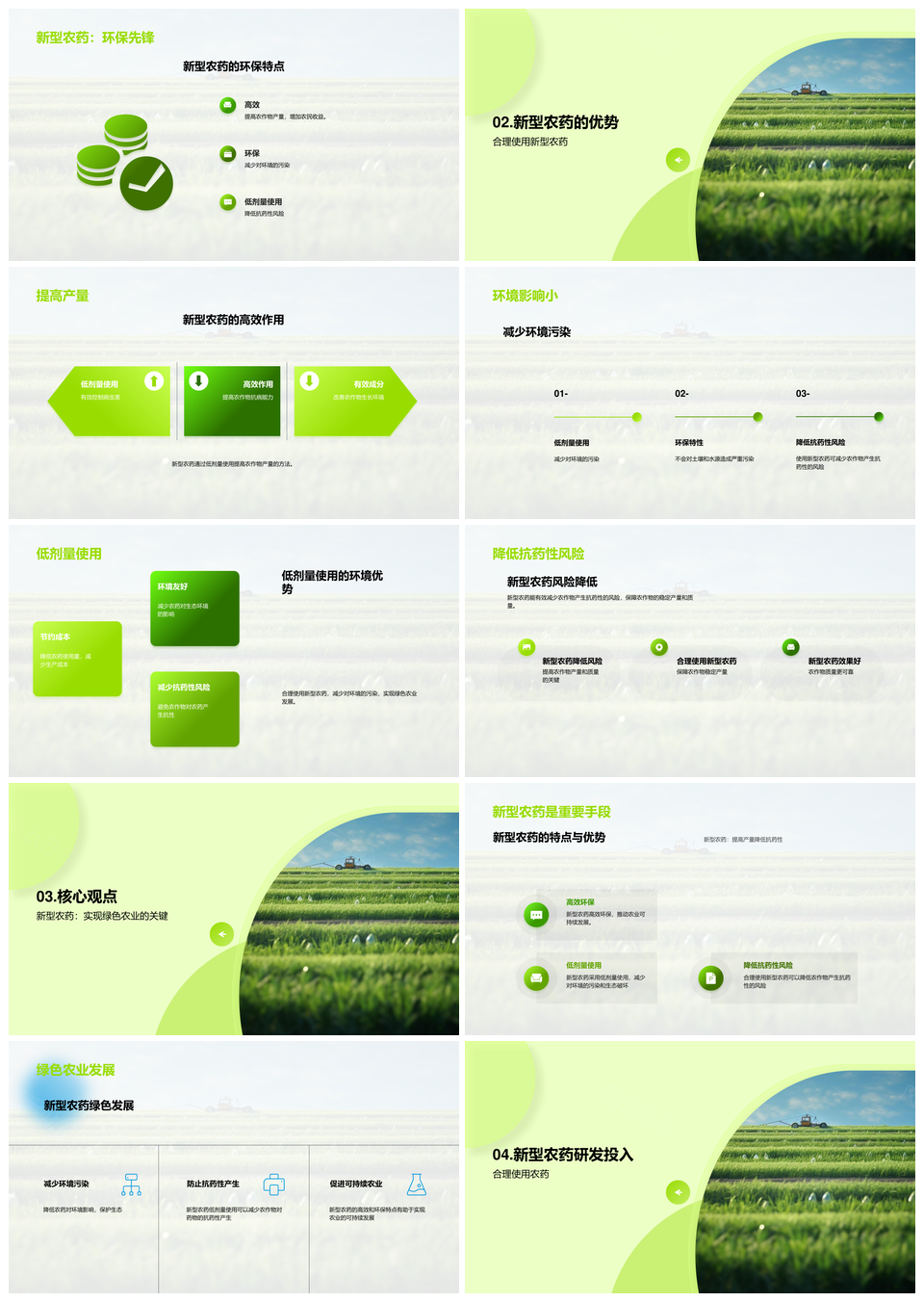 这是一张新型农药高效环保助力农田提质增产PPT模板,包含新型、农药、高效、环保、助力、农田、提质、增产等主题内容,也可用作新型农药高效环保助力、高效环保助力农田提质、助力农田提质增产、新型农药助力农田增产、高效环保提质增产、新型农药高效助力、环保助力农田提质、新型农药提质增产、高效环保助力增产、助力农田增产、新型农药高效、环保助力农田、提质增产高效、新型助力增产、农药环保农田等PPT场景使用。