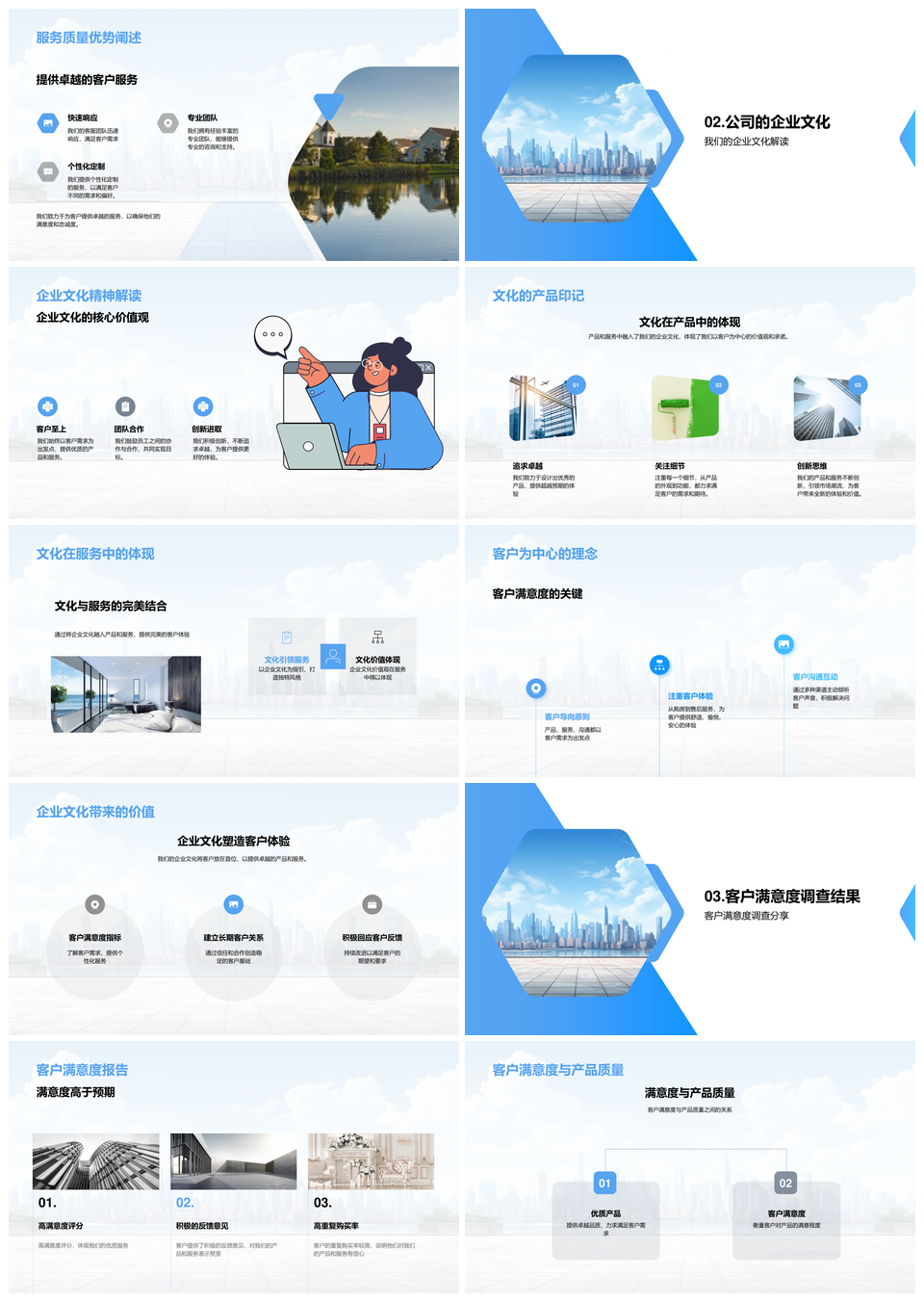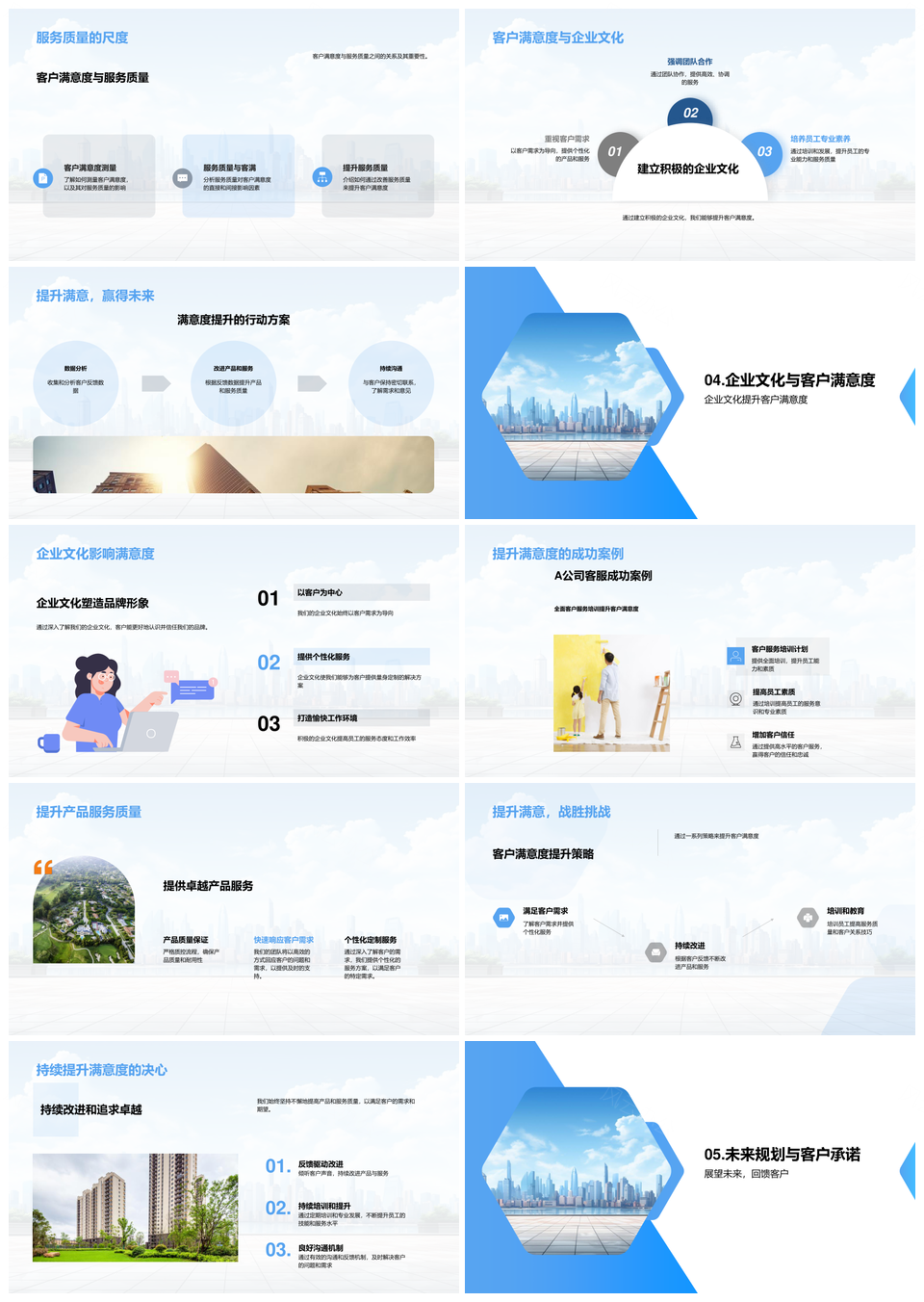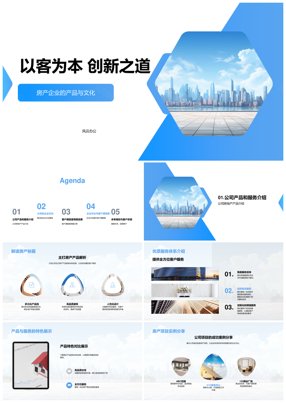风云办公提供的房产企业客户为本创新品质服务文化PPT模板,下载格式为pptx,一共33页,作品中文字及图均可以修改和编辑,图片更改请在作品中右键图片并更换,文字修改请直接点击文字进行修改。