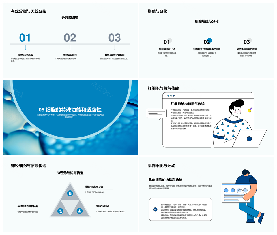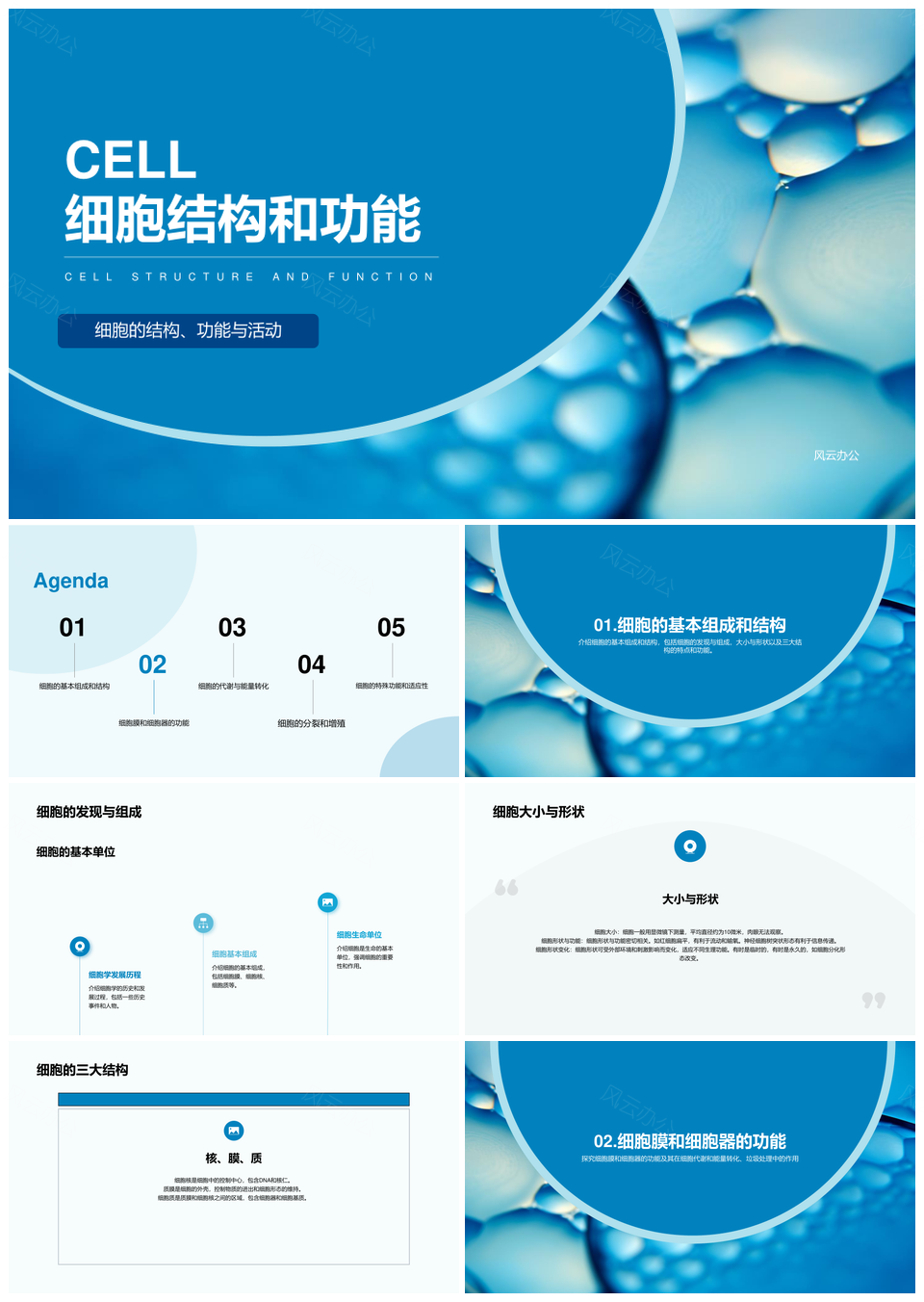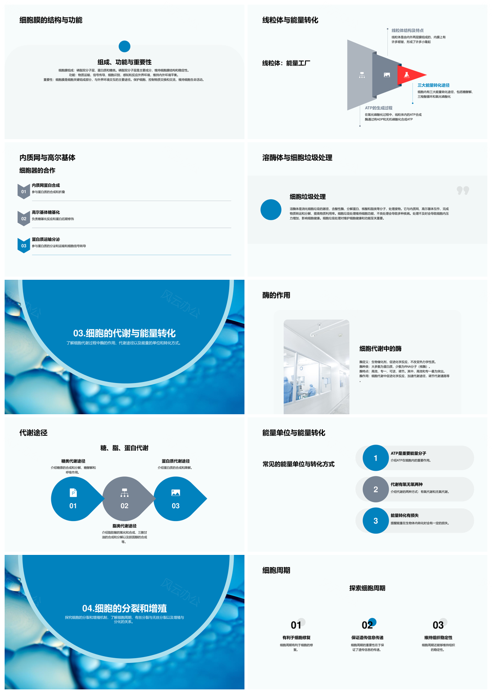 风云办公提供的蓝色细胞结构功能解析介绍PPT模板,下载格式为pptx,一共24页,作品中文字及图均可以修改和编辑,图片更改请在作品中右键图片并更换,文字修改请直接点击文字进行修改。