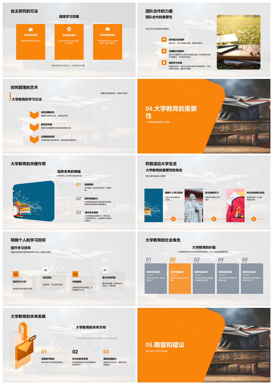 这款模板以橙色为主体色调,搭配灰白色块平衡视觉,适用于学术答辩、科研汇报等场景,封面以几何分割模拟波粒二象性的动态感,内页采用激光光束渐变与书籍叠层设计,传递理性与创新交融的氛围,毕业帽元素通过极简线条融入目录页,点明教育主题,全模板包含28页可编辑版式,涵盖数据图表、研究框架、流程推演等模块,适配理工科或教育领域的内容逻辑,色彩系统优先保障文字可读性,避免过度装饰干扰信息传达。