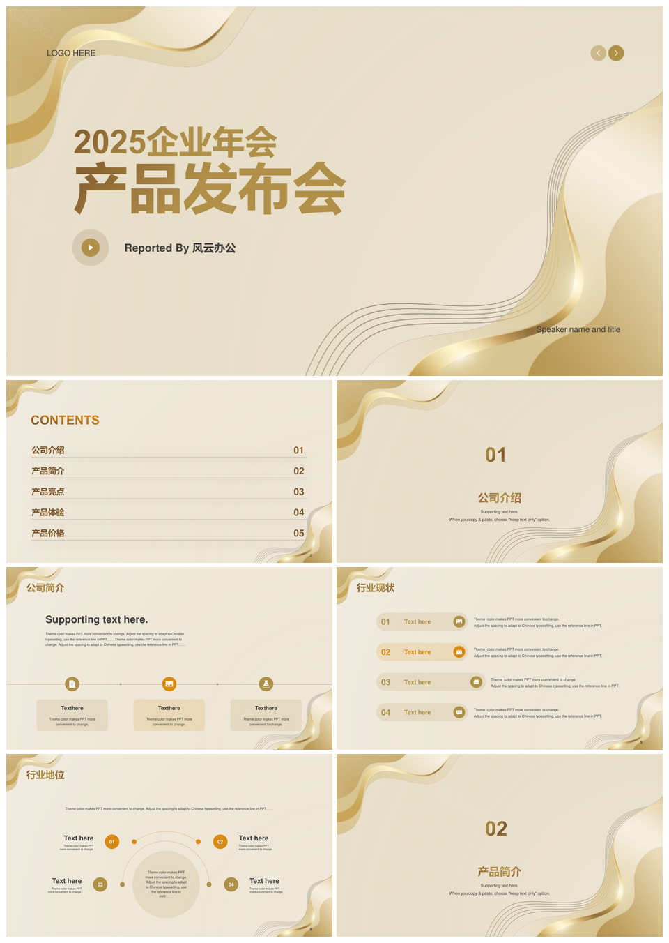 风云办公提供的2025企业金色庆典发布会黄耀全场PPT模板,下载格式为pptx,一共17页,作品中文字及图均可以修改和编辑,图片更改请在作品中右键图片并更换,文字修改请直接点击文字进行修改。
