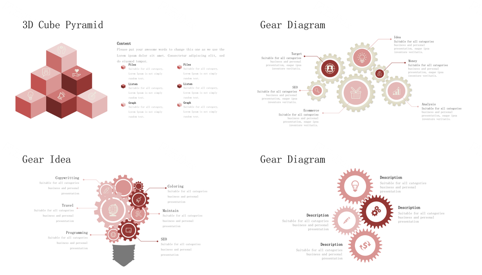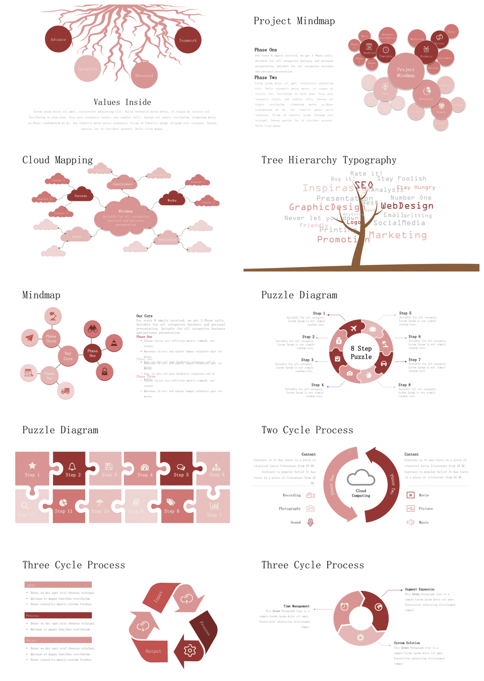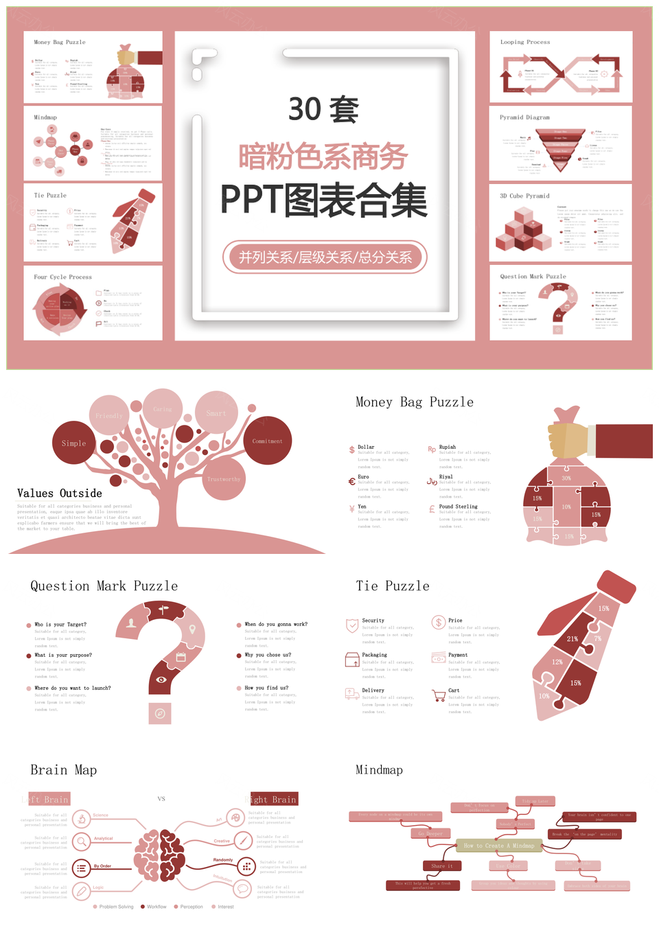 暗粉色系商务并列关系层级关系总分关系PPT图表合集推荐