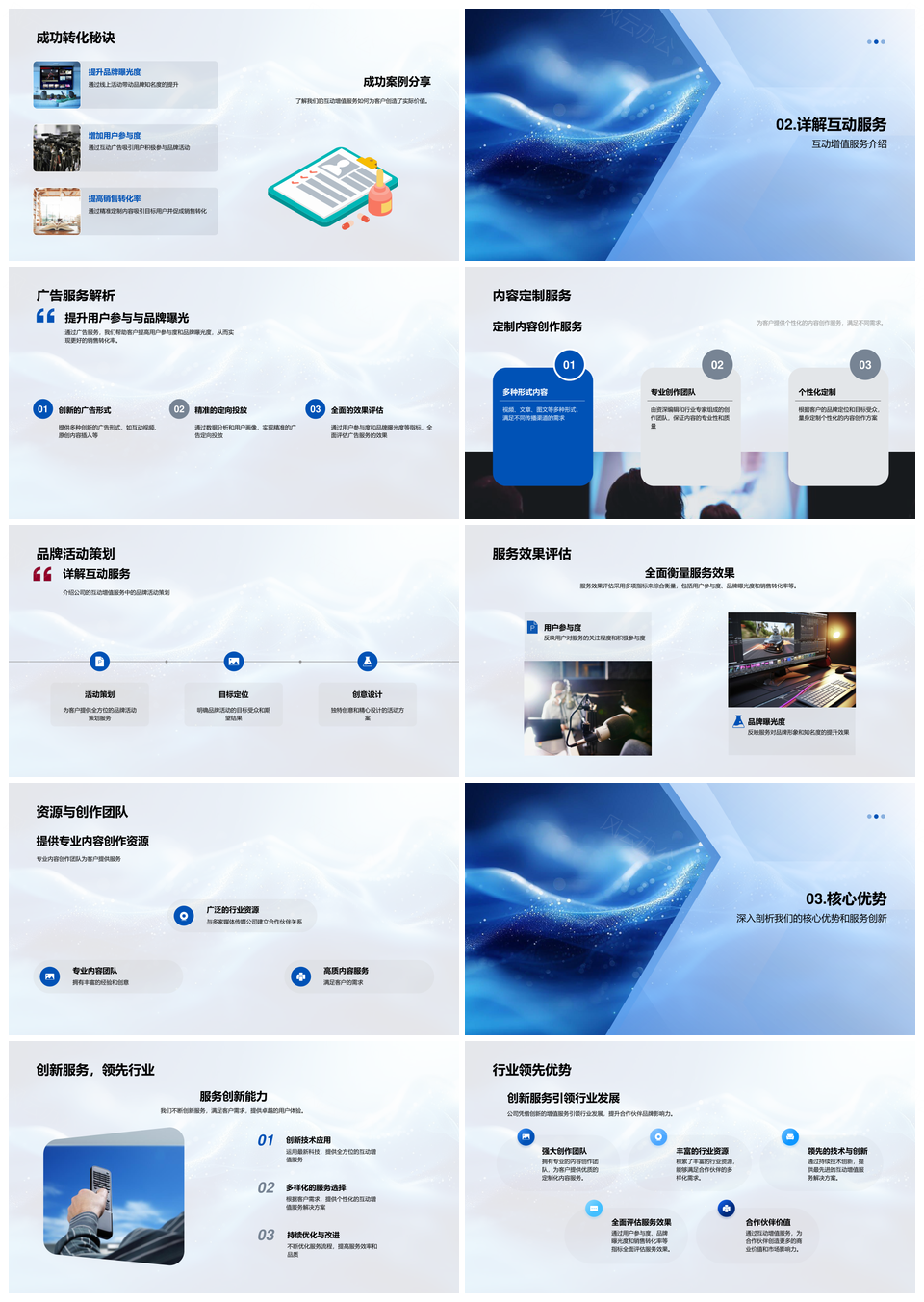 这是一张2025互动增值服务助推品牌力行业宣传内容活动策划PPT模板,包含2025、互动、增值服务、助推、品牌力、行业、宣传内容、活动、策划等主题内容,也可用作2025互动增值服务助推、互动增值服务助推品牌力、增值服务助推品牌力行业、助推品牌力行业宣传、品牌力行业宣传内容、行业宣传内容活动策划、2025互动增值服务、互动增值服务助推、增值服务助推品牌力、助推品牌力行业、品牌力行业宣传、行业宣传内容、宣传内容活动策划、2025互动、互动增值服务、内容活动策划等PPT场景使用。 风云办公提供的2025互动增值服务助推品牌力行业宣传内容活动策划PPT模板,下载格式为pptx,一共33页,作品中文字及图均可以修改和编辑,图片更改请在作品中右键图片并更换,文字修改请直接点击文字进行修改。