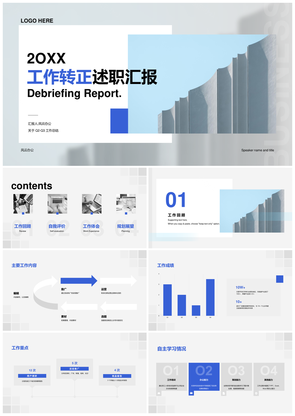 风云办公提供的灰蓝矩形色块商务转正述职汇报PPT模板,下载格式为pptx,一共15页,作品中文字及图均可以修改和编辑,图片更改请在作品中右键图片并更换,文字修改请直接点击文字进行修改。