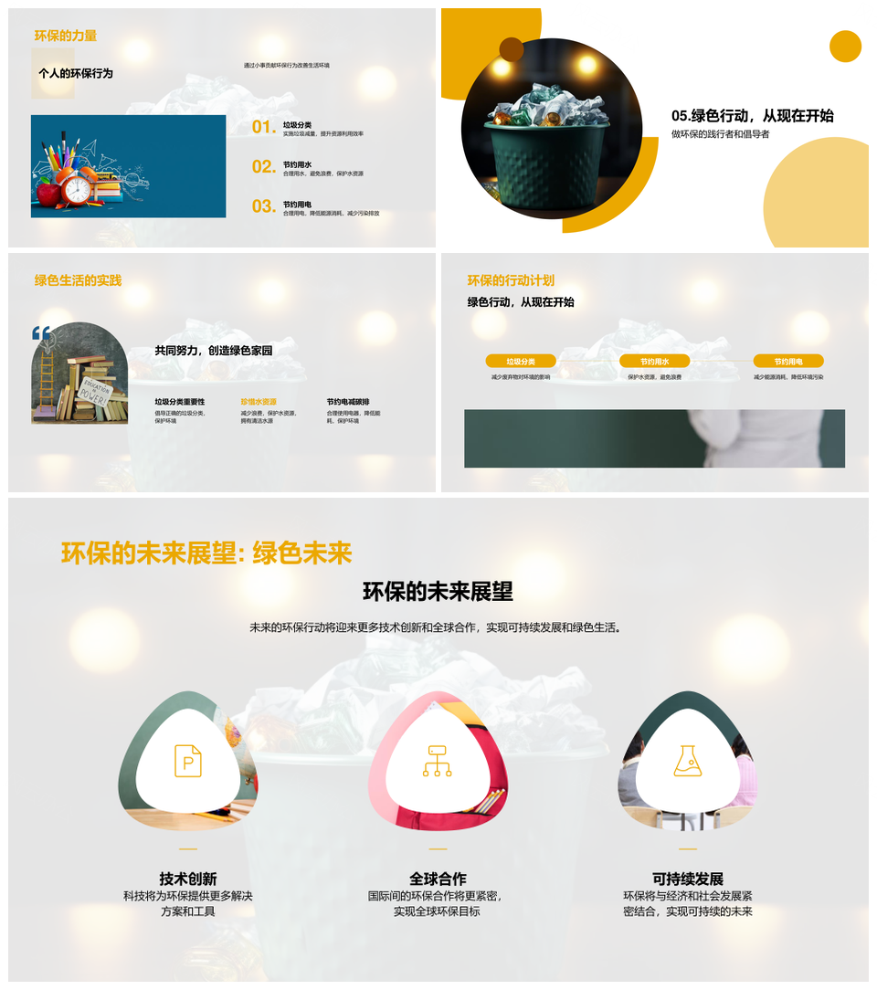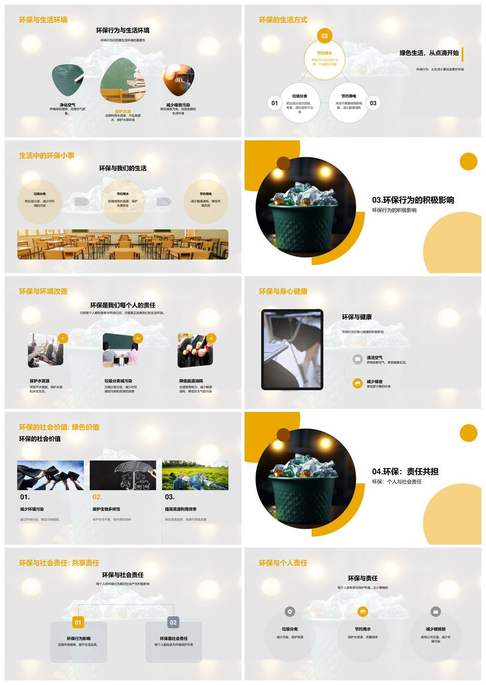 这是一张环保教育垃圾分类节约水电绿色行动人人有责PPT模板,包含环保教育、垃圾分类、节约水电、绿色行动、人人有责等主题内容,也可用作环保教育垃圾分类节约水电、环保教育垃圾分类绿色行动、环保教育垃圾分类人人有责、环保教育节约水电绿色行动、垃圾分类节约水电绿色行动、垃圾分类绿色行动人人有责、节约水电绿色行动人人有责、环保教育垃圾分类节约、环保教育垃圾分类水电、垃圾分类节约水电绿色行动、环保教育节约水电、垃圾分类绿色行动、环保教育绿色行动、绿色行动人人有责、垃圾分类人人有责等PPT场景使用。 风云办公提供的环保教育垃圾分类节约水电绿色行动人人有责PPT模板,下载格式为pptx,一共23页,作品中文字及图均可以修改和编辑,图片更改请在作品中右键图片并更换,文字修改请直接点击文字进行修改。