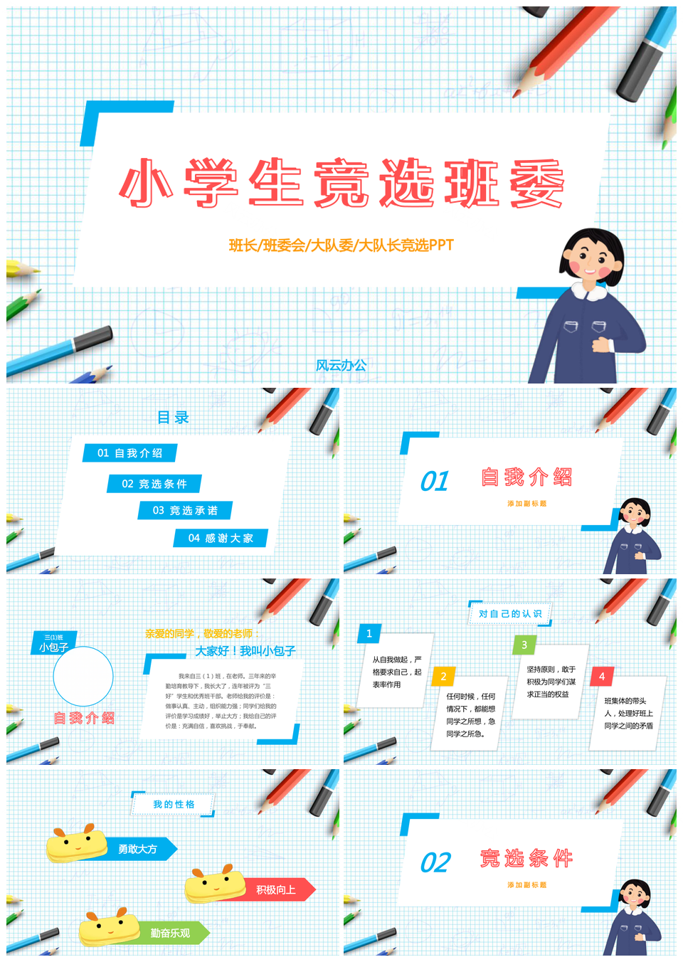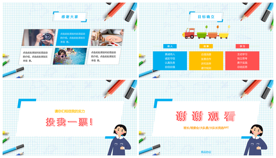 风云办公提供的班长/班委会/大队委/大队长竞选PPT模板,下载格式为pptx,一共21页,作品中文字及图均可以修改和编辑,图片更改请在作品中右键图片并更换,文字修改请直接点击文字进行修改。