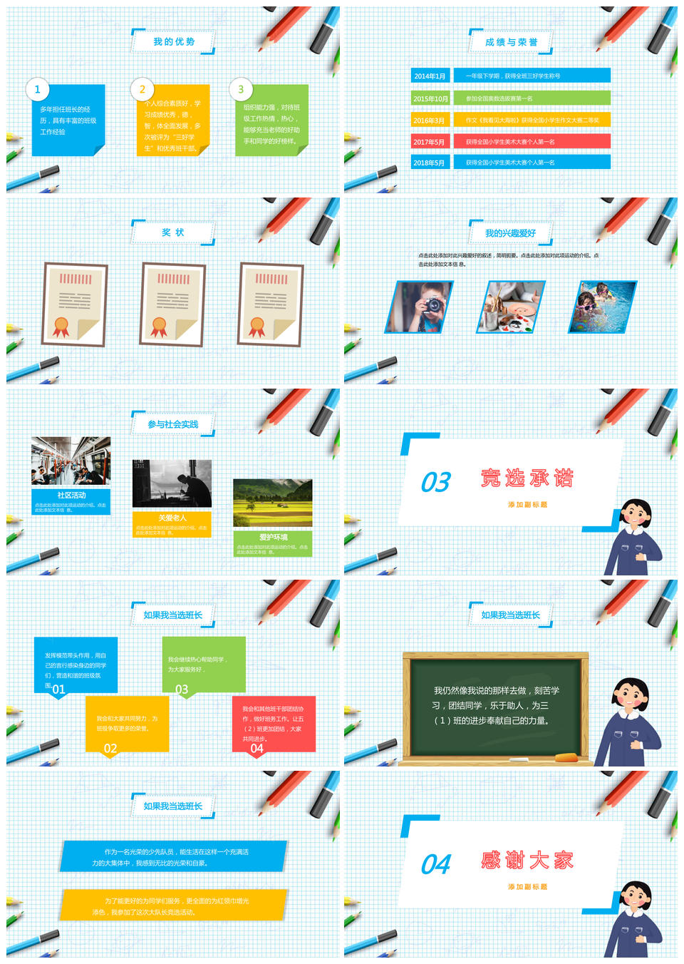 这是一张班长/班委会/大队委/大队长竞选PPT模板,包含班长、班委会、大队委、大队长、竞选等主题内容,也可用作班长、班委会、大队委、大队长、竞选