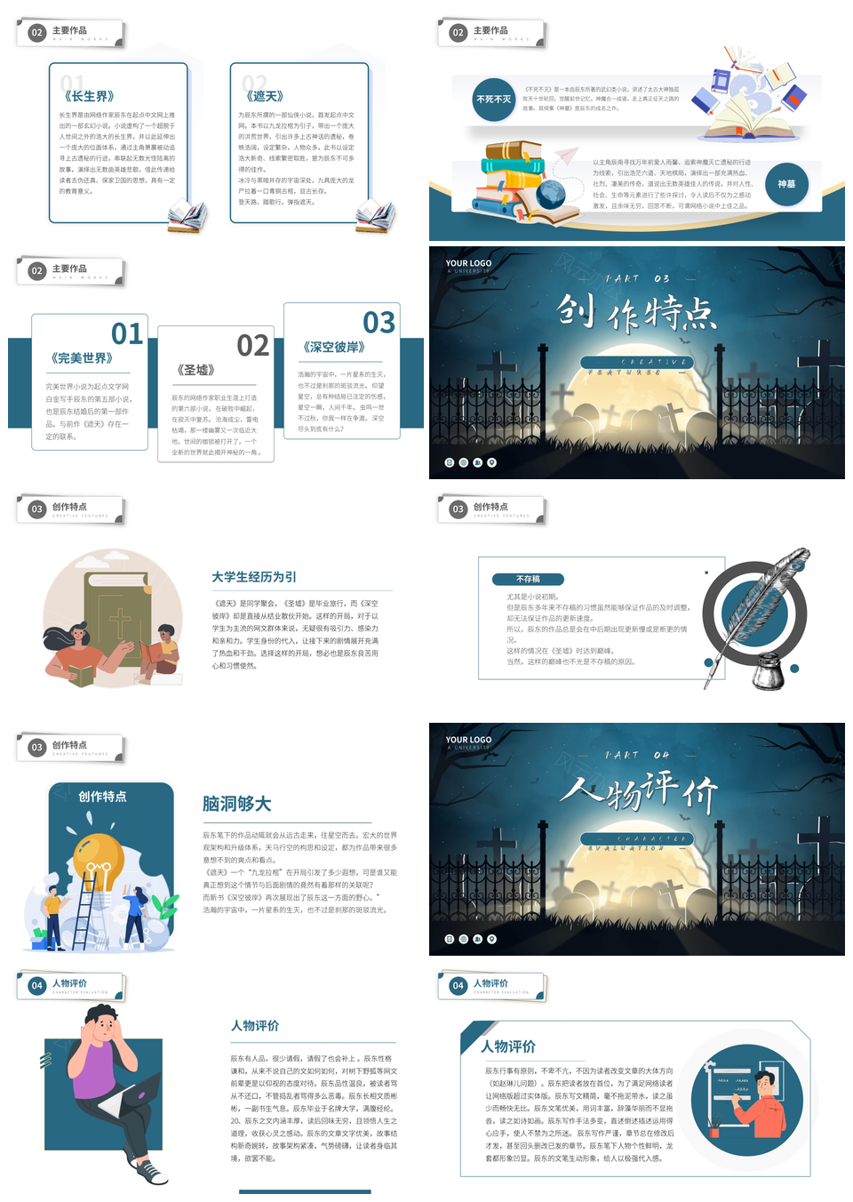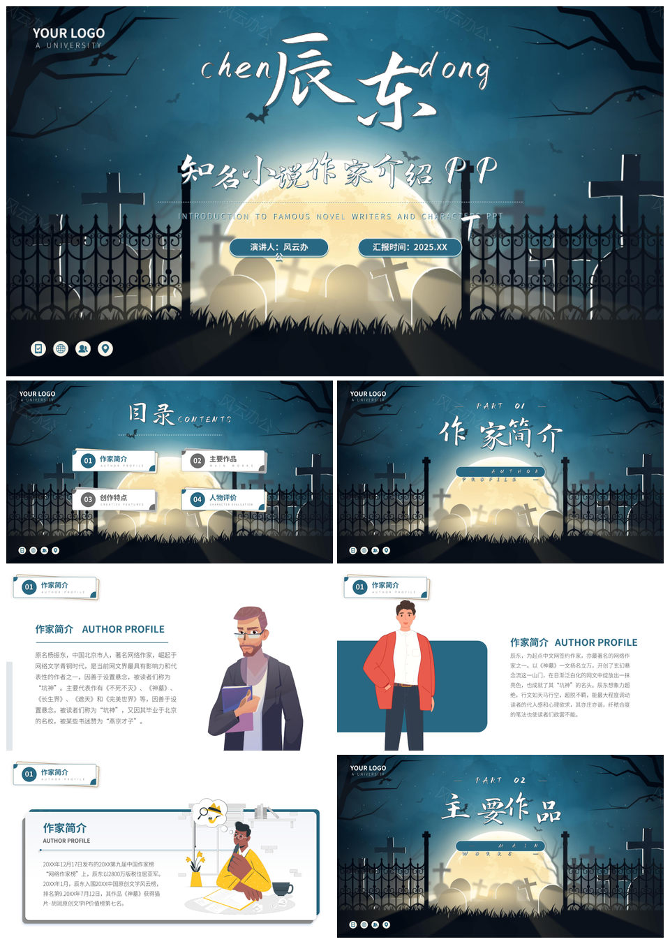 以卡通插画风格呈现深邃夜空下的现代公司场景,蓝色主调搭配黑白对比,营造冷静专业的商务氛围。墓碑剪影与自行车元素隐喻突破阻碍的发展历程,巧妙融入业绩增长时间轴及用户数据图表。模块化排版适配年度总结、盈利分析及战略汇报场景,白色信息容器确保数据清晰可视,深蓝背景聚焦核心成果。图表区采用简约线性设计,结合抽象建筑轮廓强化企业属性,理性视觉语言精准传递业务亮点与市场增长点。左侧导航栏支持快速定位财务模块与用户运营板块,适应多维度汇报需求。