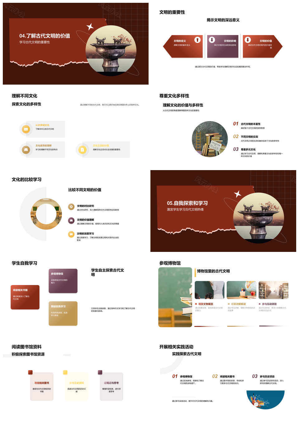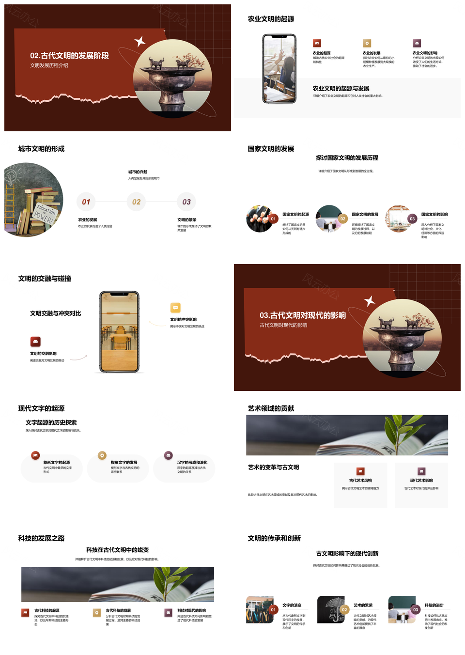 这是一张古代农业城市国家文明文字艺术科技文物探源PPT模板,包含农业、城市、国家、文明、文字、艺术、科技、文物、探源等主题内容,也可用作古代农业城市国家、农业城市国家文明、城市国家文明文字、国家文明文字艺术、文明文字艺术科技、文字艺术科技文物、艺术科技文物探源、古代农业文明科技、农业文明科技文物、城市国家文字艺术、国家文字艺术科技、文明艺术科技文物、古代农业科技探源、农业文物探源、城市文明艺术科技等PPT场景使用。 风云办公提供的古代农业城市国家文明文字艺术科技文物探源PPT模板,下载格式为pptx,一共28页,作品中文字及图均可以修改和编辑,图片更改请在作品中右键图片并更换,文字修改请直接点击文字进行修改。