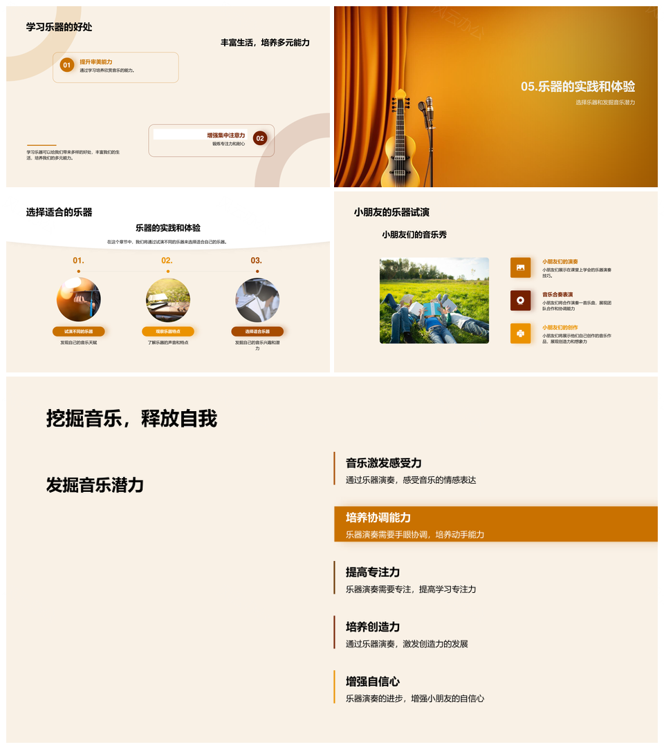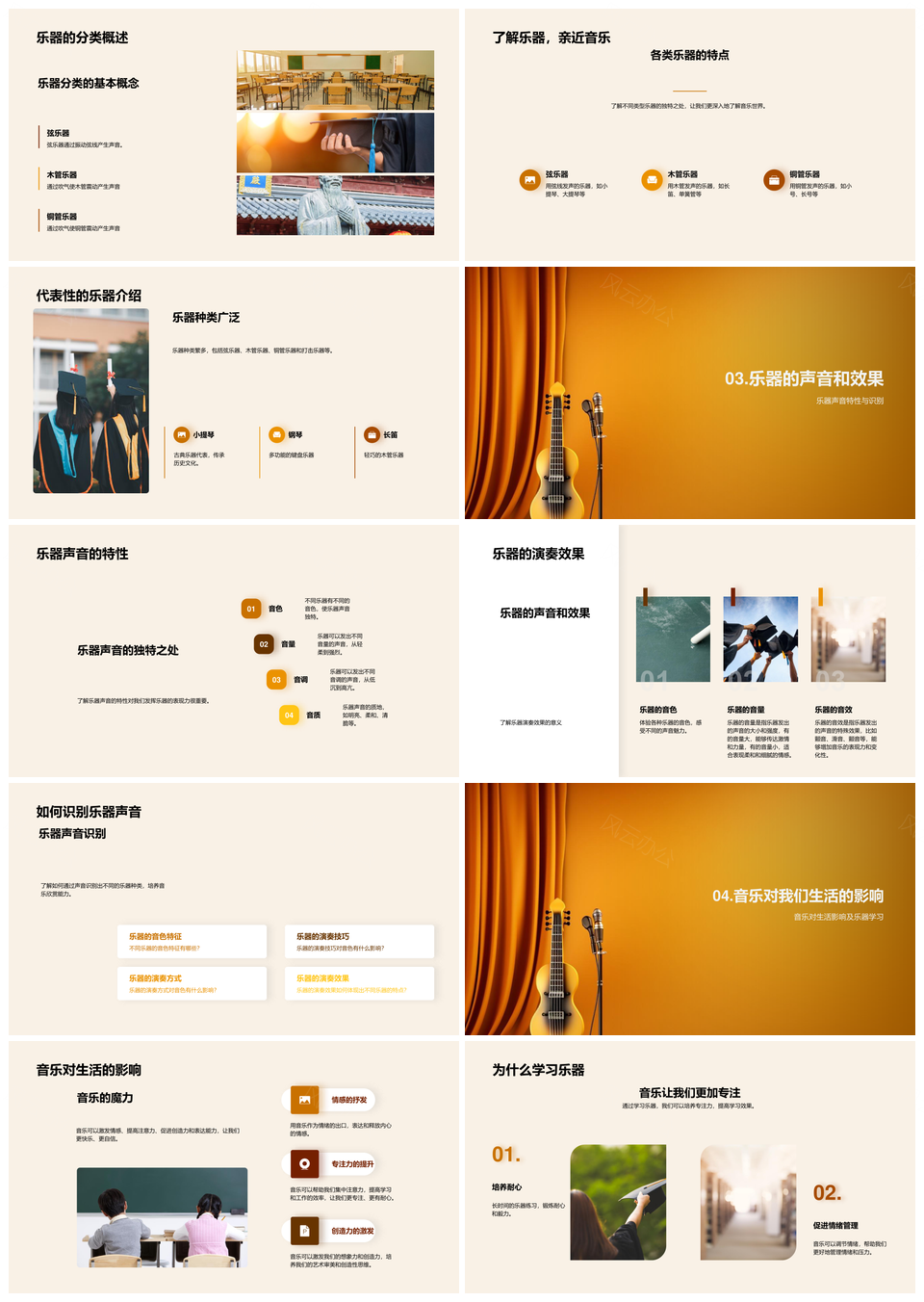 风云办公提供的音乐元素乐器分类声效符号与生活影响PPT模板,下载格式为pptx,一共23页,作品中文字及图均可以修改和编辑,图片更改请在作品中右键图片并更换,文字修改请直接点击文字进行修改。