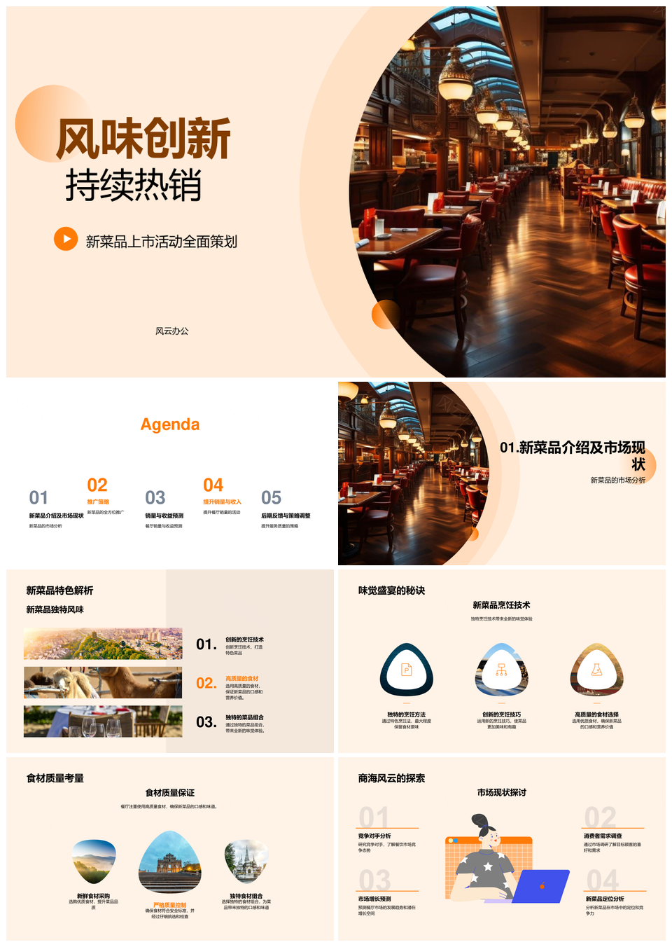 风云办公提供的风味创新新品线上线下促销热销PPT模板,下载格式为pptx,一共33页,作品中文字及图均可以修改和编辑,图片更改请在作品中右键图片并更换,文字修改请直接点击文字进行修改。