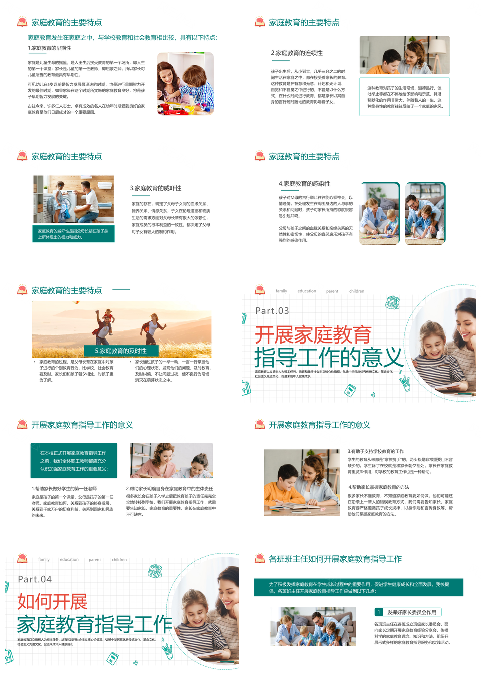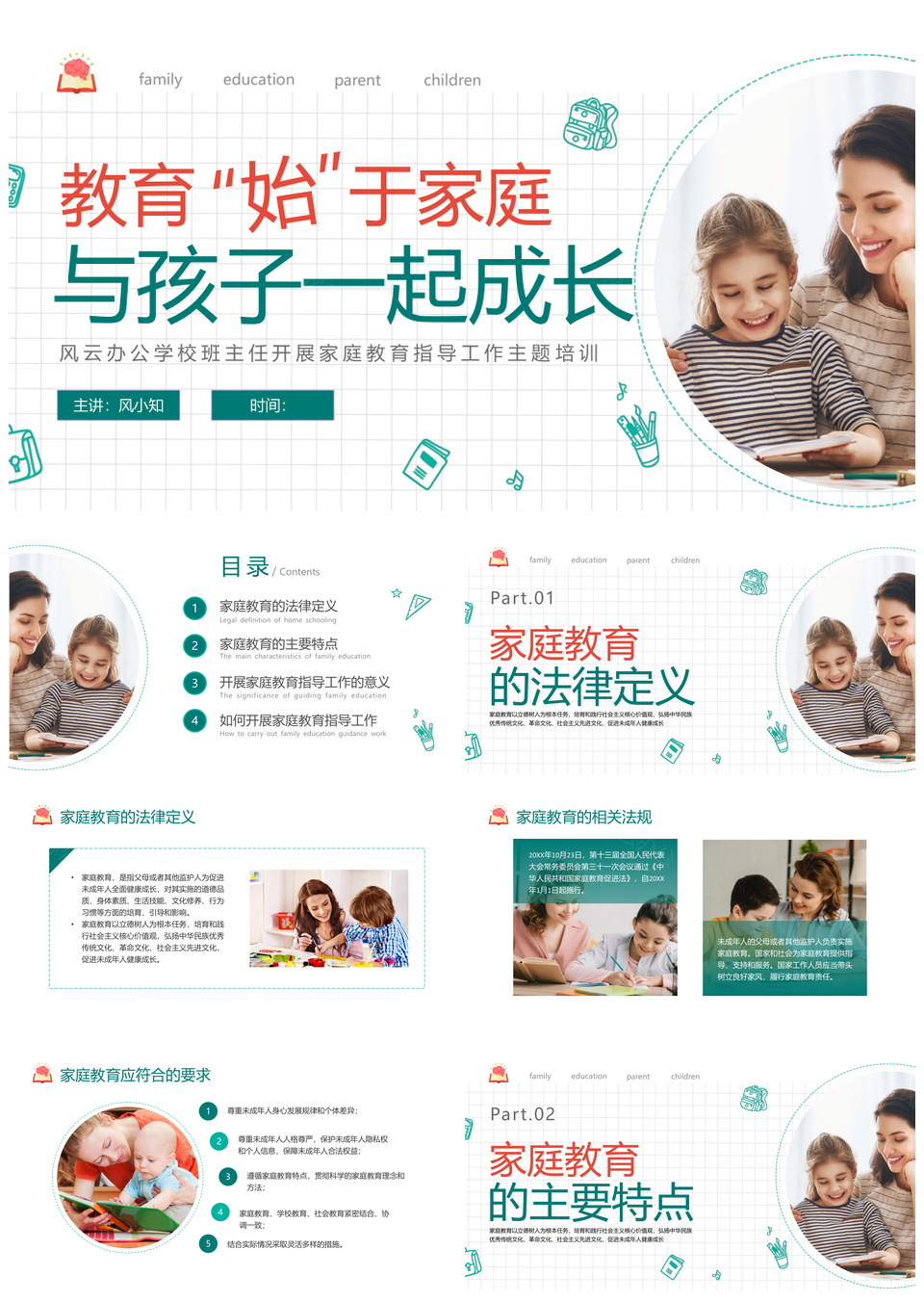 绿色商务简笔画家庭教育家长培训家校共育PPT模板