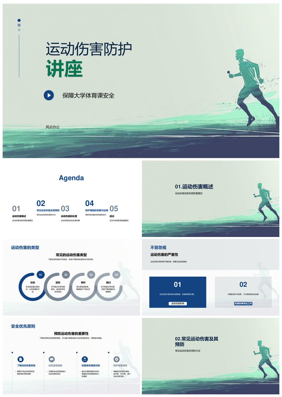 风云办公提供的大学体育课运动伤害类型防护处理教学课件,下载格式为pptx,一共24页,作品中文字及图均可以修改和编辑,图片更改请在作品中右键图片并更换,文字修改请直接点击文字进行修改。