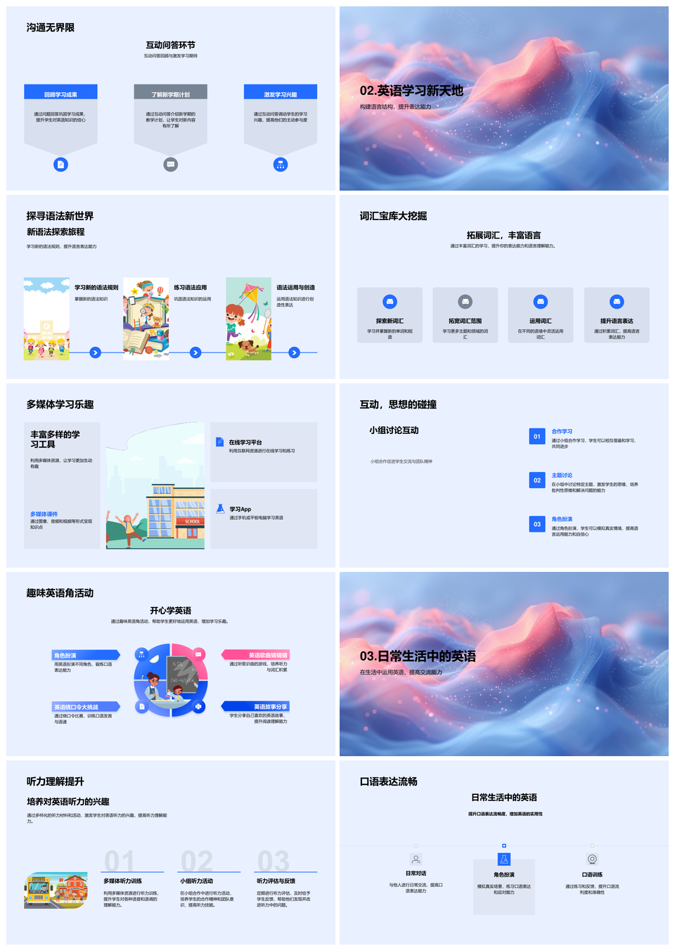 这是一张小学英语学期目标语法词汇听力互动多媒体教学PPT模板,包含小学英语、学期目标、语法、词汇、听力、互动、多媒体、教学等主题内容,也可用作小学英语学期目标语法词汇听力互动多媒体教学、小学英语学期目标语法词汇听力、学期目标语法词汇听力互动、目标语法词汇听力互动多媒体、语法词汇听力互动多媒体教学、词汇听力互动多媒体教学、小学英语学期目标语法词汇、学期目标语法词汇听力、目标语法词汇听力互动、语法词汇听力互动多媒体、词汇听力互动多媒体、听力互动多媒体教学、小学英语学期目标语法、学期目标语法词汇、目标语法词汇听力等PPT场景使用。 风云办公提供的小学英语学期目标语法词汇听力互动多媒体教学PPT模板,下载格式为pptx,一共33页,作品中文字及图均可以修改和编辑,图片更改请在作品中右键图片并更换,文字修改请直接点击文字进行修改。