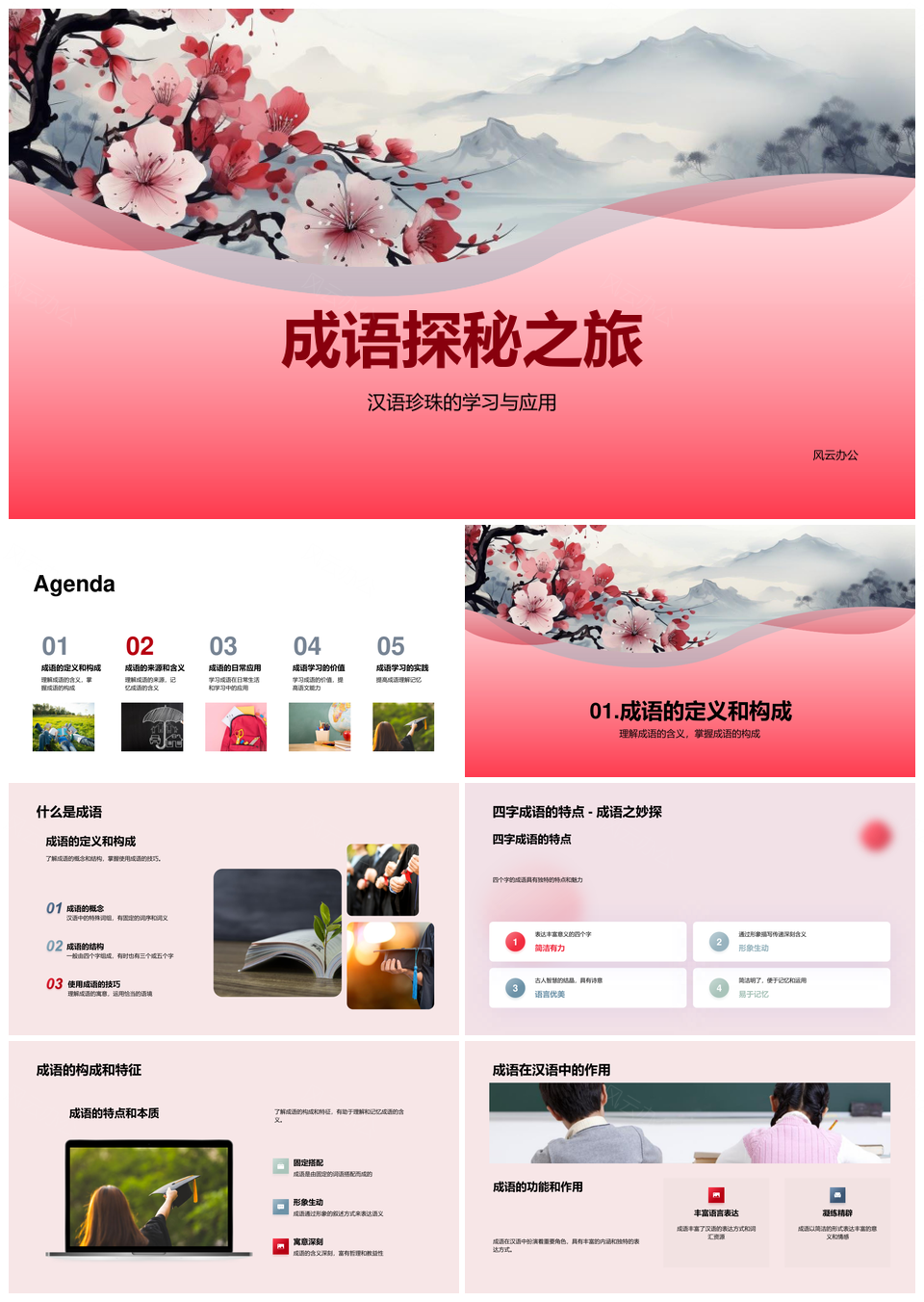 风云办公提供的汉语四字成语源流构成古卷应用探秘PPT模板,下载格式为pptx,一共24页,作品中文字及图均可以修改和编辑,图片更改请在作品中右键图片并更换,文字修改请直接点击文字进行修改。