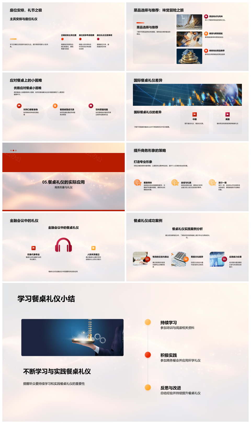 这是一张2025金融会议商务餐会餐桌礼仪形象餐具对话座位菜品PPT模板,包含2025、金融会议、商务餐会、餐桌礼仪、形象、餐具、对话、座位、菜品等主题内容,也可用作2025金融会议商务餐会餐桌礼仪形象餐具、金融会议商务餐会餐桌礼仪形象、商务餐会餐桌礼仪形象餐具、餐桌礼仪形象餐具对话座位、形象餐具对话座位菜品、2025金融会议商务餐会、金融会议商务餐会餐桌礼仪、商务餐会餐桌礼仪形象、餐桌礼仪形象餐具对话、餐具对话座位菜品、金融会议商务餐会、商务餐会餐桌礼仪、餐桌礼仪形象、餐具对话座位、座位菜品等PPT场景使用。 风云办公提供的2025金融会议商务餐会餐桌礼仪形象餐具对话座位菜品PPT模板,下载格式为pptx,一共27页,作品中文字及图均可以修改和编辑,图片更改请在作品中右键图片并更换,文字修改请直接点击文字进行修改。
