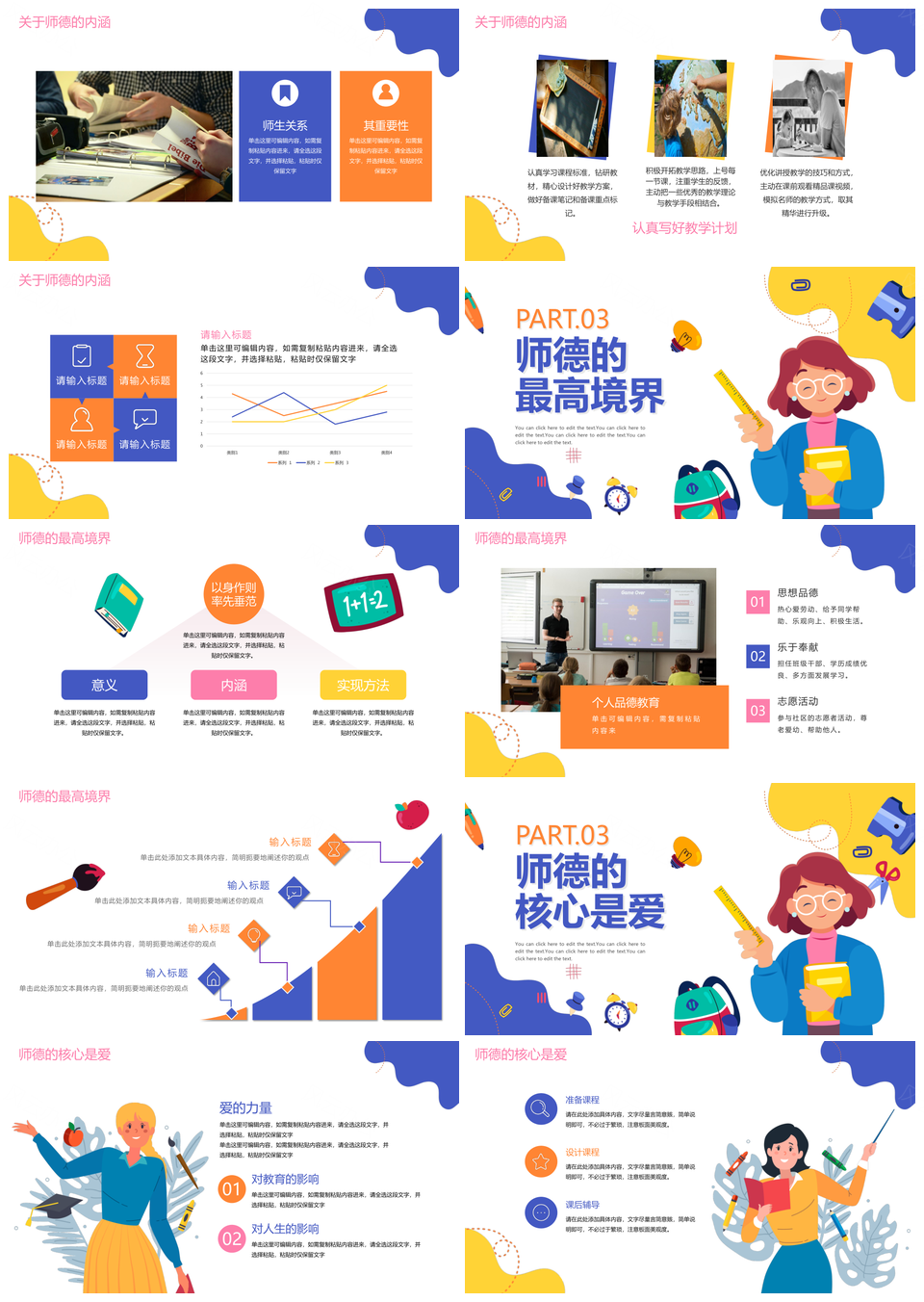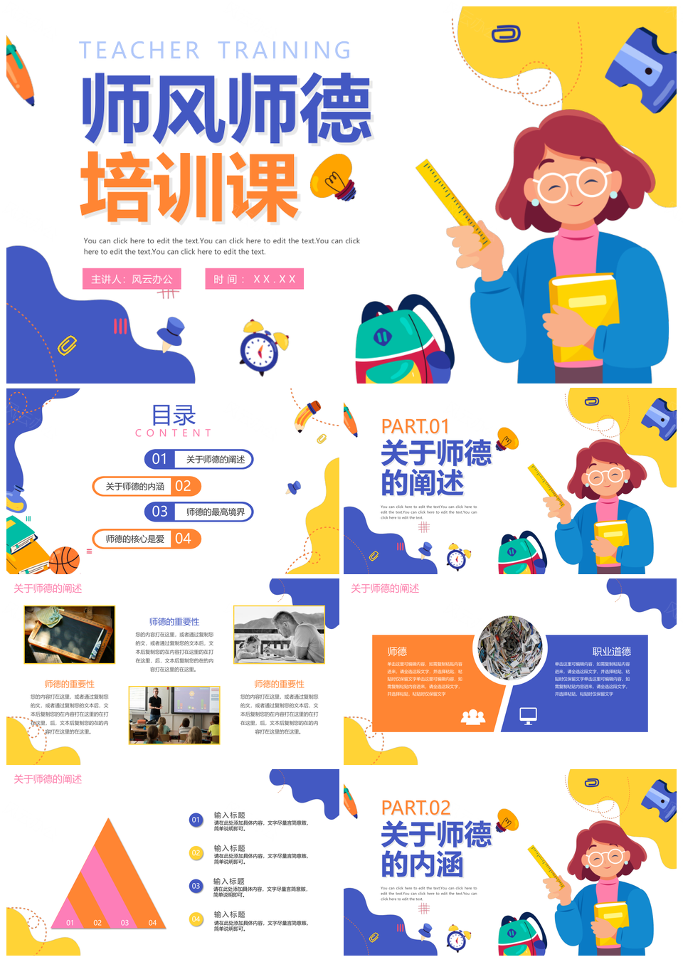 风云办公提供的手绘卡通活泼扁平师德师风教师培训PPT模板,下载格式为pptx,一共19页,作品中文字及图均可以修改和编辑,图片更改请在作品中右键图片并更换,文字修改请直接点击文字进行修改。