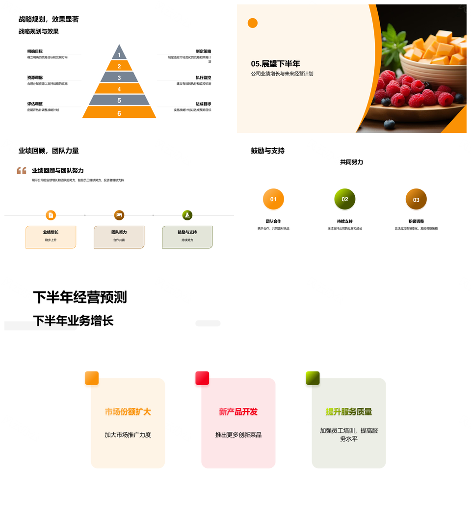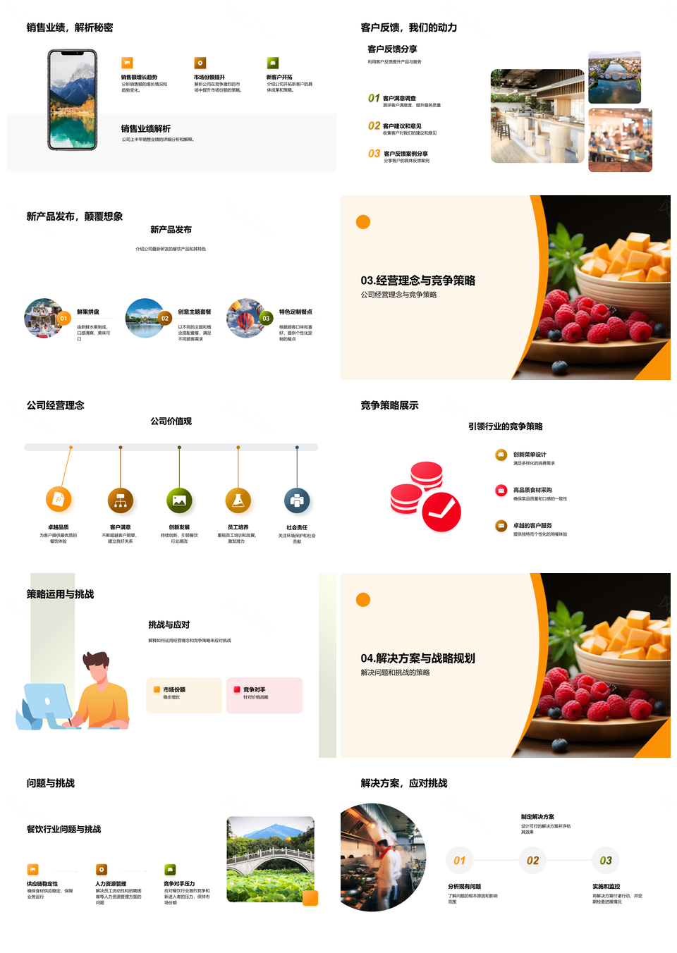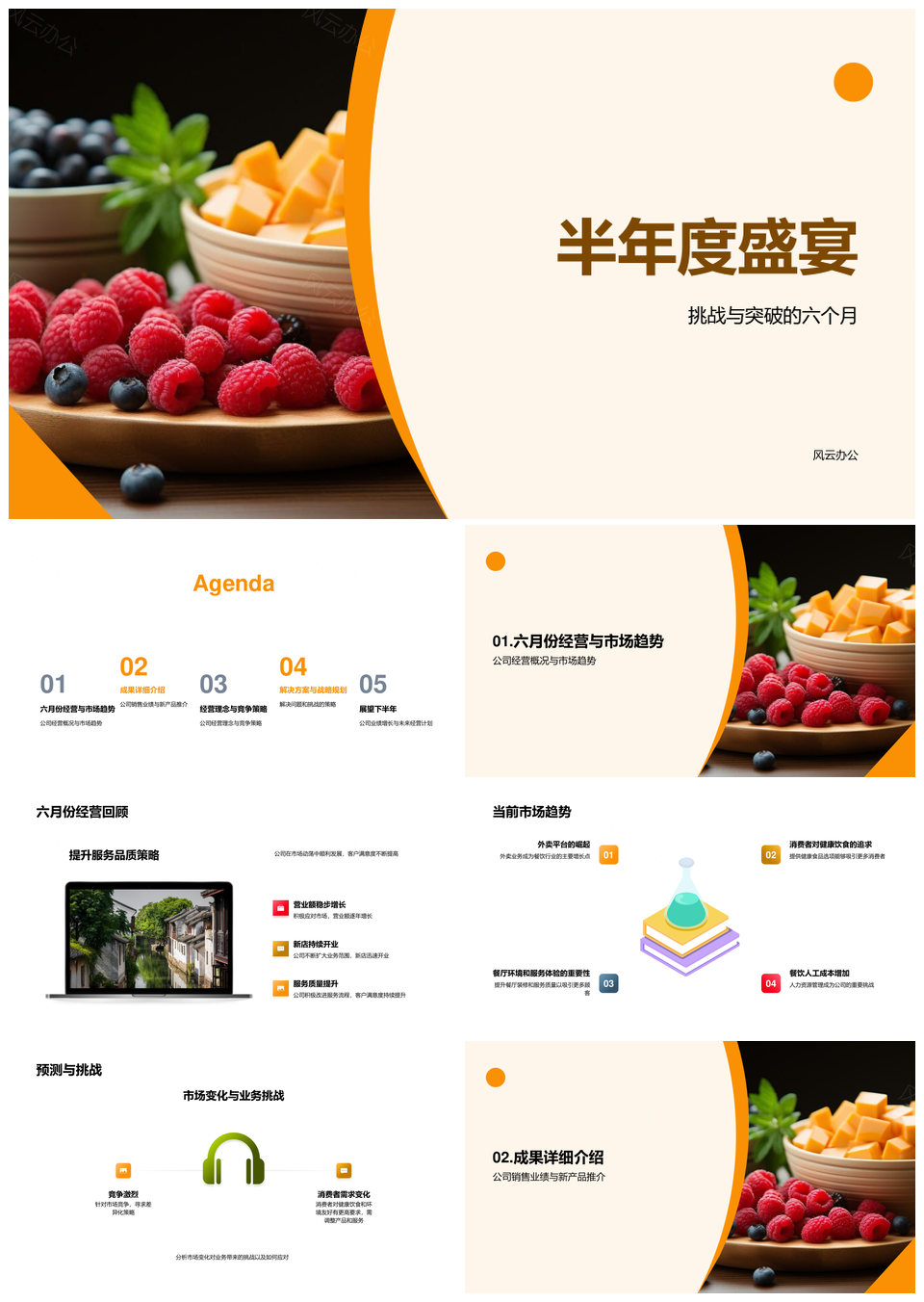 风云办公提供的餐饮半年度盛宴趋势挑战业绩新品口碑PPT模板,下载格式为pptx,一共23页,作品中文字及图均可以修改和编辑,图片更改请在作品中右键图片并更换,文字修改请直接点击文字进行修改。
