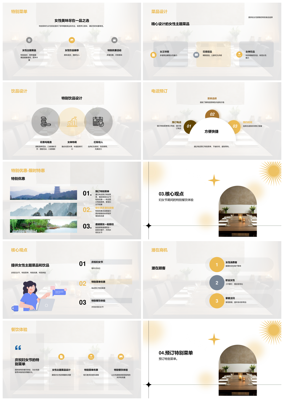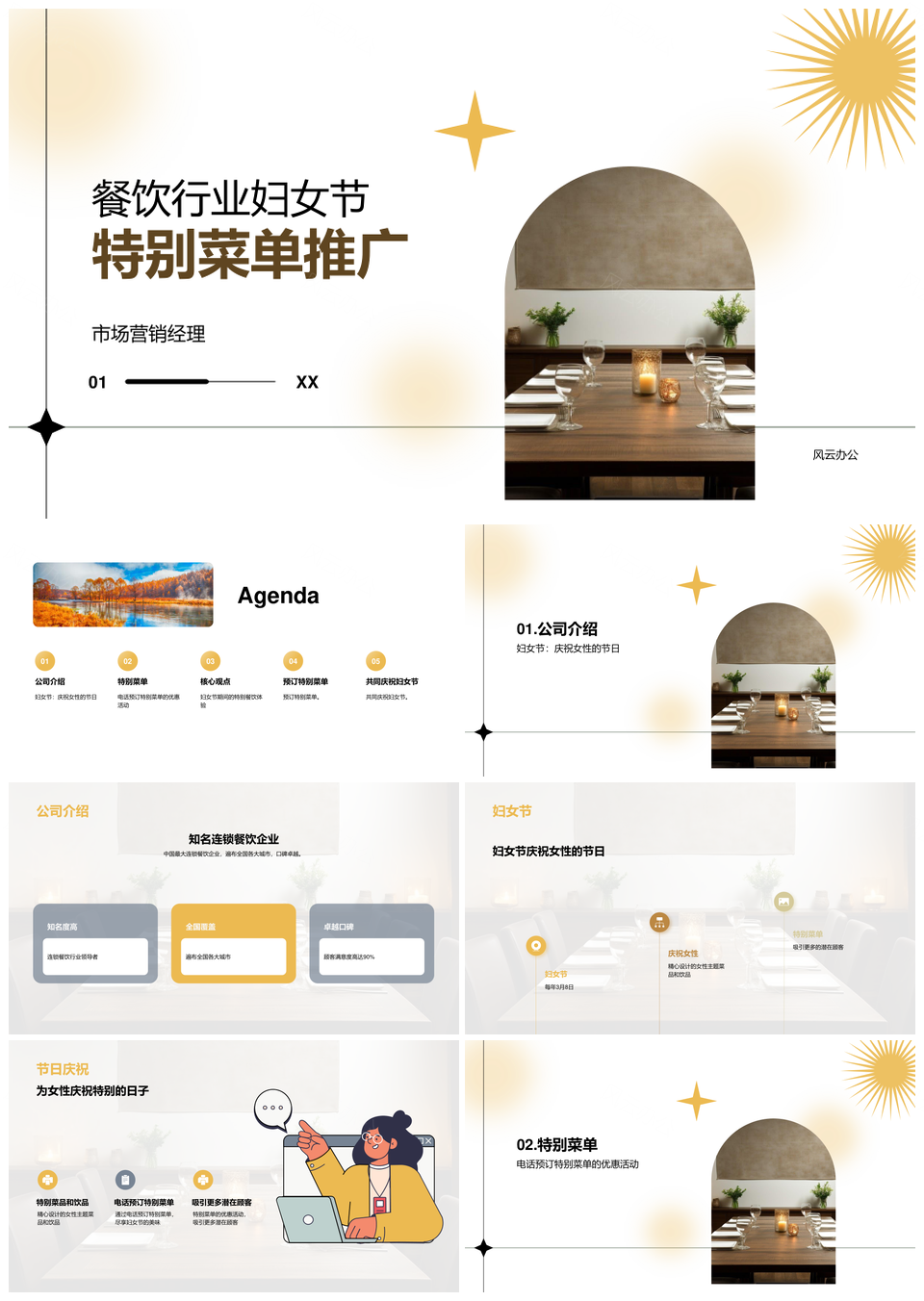 风云办公提供的连锁餐饮妇女节女性主题菜单推广PPT模板,下载格式为pptx,一共24页,作品中文字及图均可以修改和编辑,图片更改请在作品中右键图片并更换,文字修改请直接点击文字进行修改。