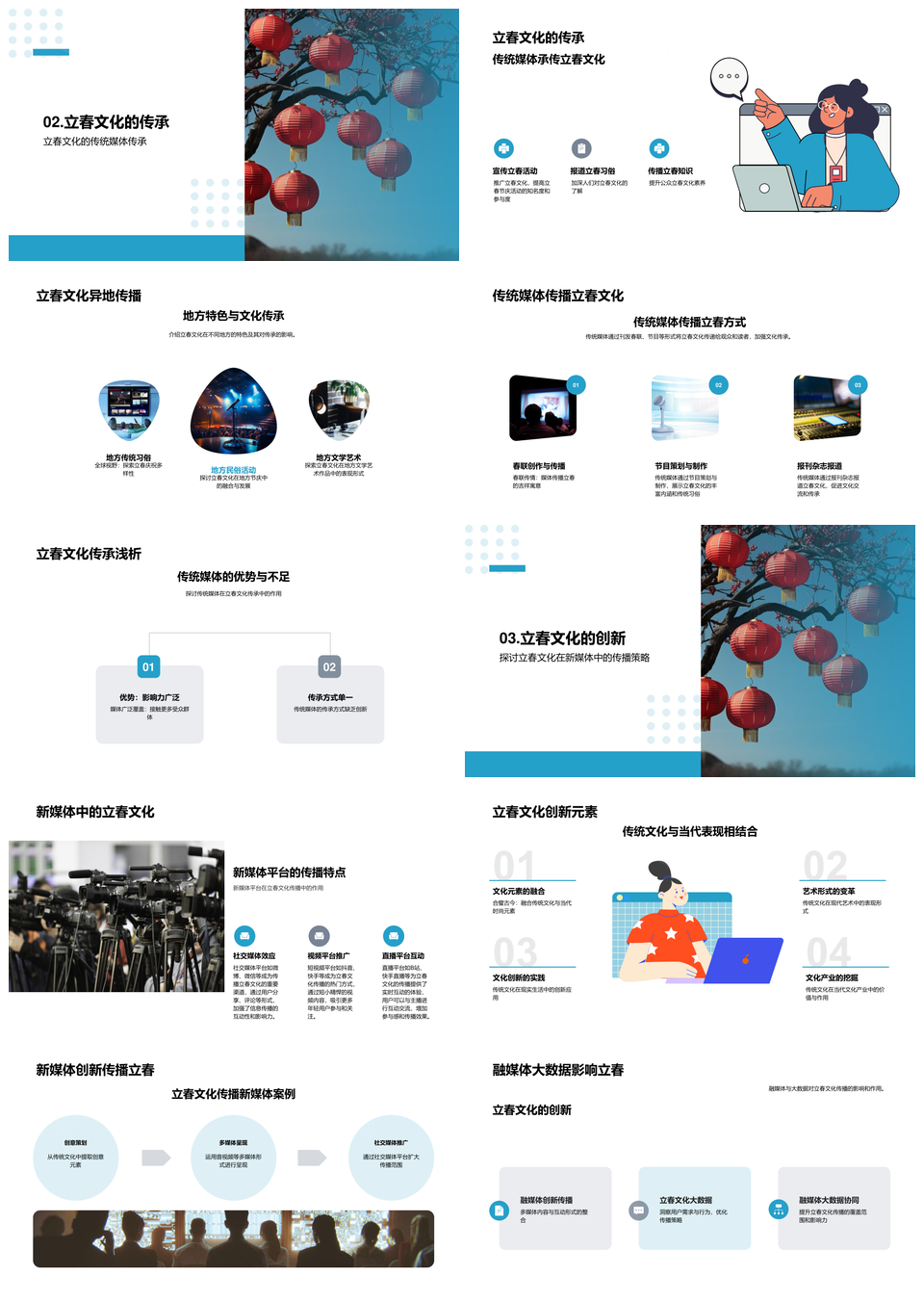 这是一张2025立春文化媒体传播演变与农耕灯笼传承PPT模板,包含立春、文化、媒体、传播、演变、农耕、灯笼、传承等主题内容,也可用作2025立春文化媒体传播演变、立春文化媒体传播、文化媒体传播演变、媒体传播演变传承、农耕灯笼传承演变、2025立春农耕灯笼、立春农耕灯笼传承、文化传播演变传承、农耕文化灯笼传承、传播演变农耕灯笼、立春媒体传播演变、2025立春文化传播、文化媒体农耕传承、立春演变灯笼文化、媒体传播农耕文化等PPT场景使用。 风云办公提供的2025立春文化媒体传播演变与农耕灯笼传承PPT模板,下载格式为pptx,一共26页,作品中文字及图均可以修改和编辑,图片更改请在作品中右键图片并更换,文字修改请直接点击文字进行修改。