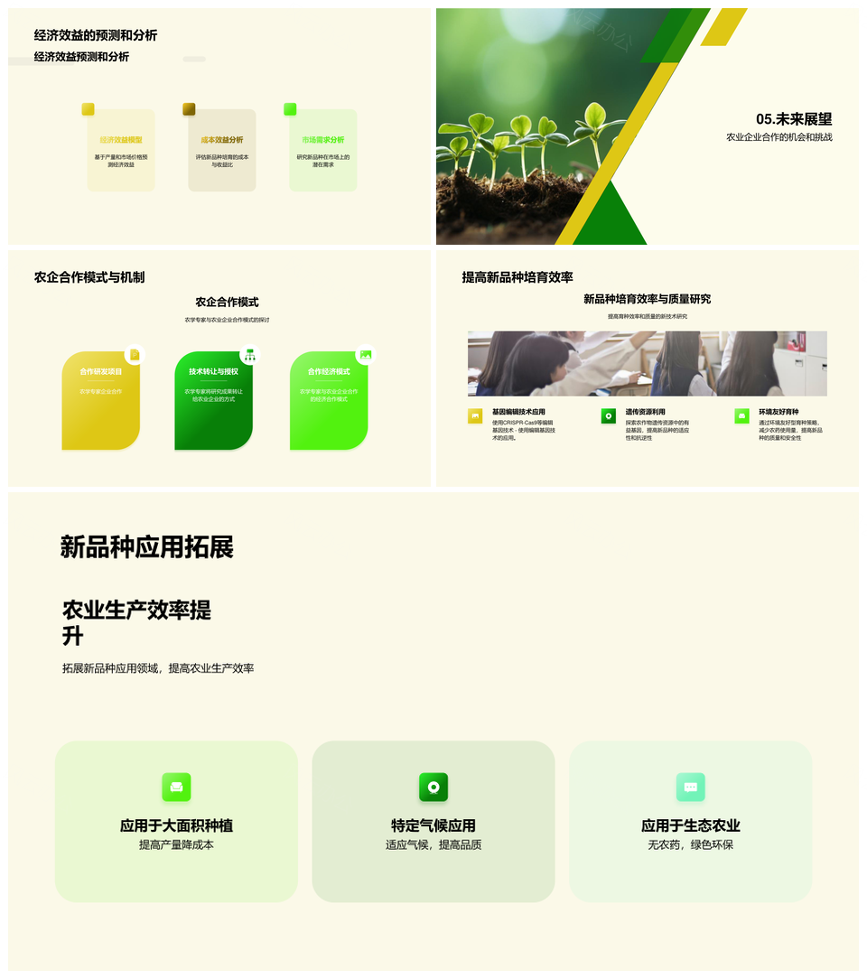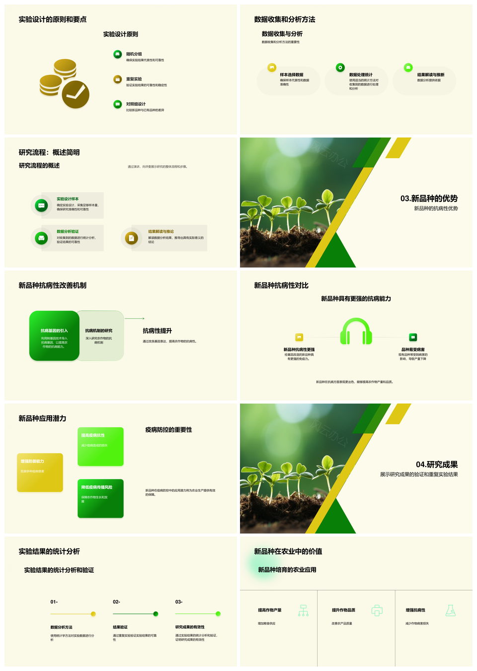 这是一张农学专家农作物育种创新突破新品种答辩PPT模板,包含农学专家、农作物、育种、创新、突破、新品种、答辩等主题内容,也可用作农学专家农作物育种创新突破、农学专家农作物育种创新、农学专家农作物育种突破、农学专家农作物创新突破、农学专家育种创新突破、农学专家创新突破新品种、农学农作物育种创新突破、专家农作物育种创新突破、农作物育种创新突破新品种、农学专家农作物育种、农学专家育种创新、农作物育种创新突破、专家农作物育种创新、育种创新突破新品种、创新突破新品种答辩等PPT场景使用。 风云办公提供的农学专家农作物育种创新突破新品种答辩PPT模板,下载格式为pptx,一共23页,作品中文字及图均可以修改和编辑,图片更改请在作品中右键图片并更换,文字修改请直接点击文字进行修改。