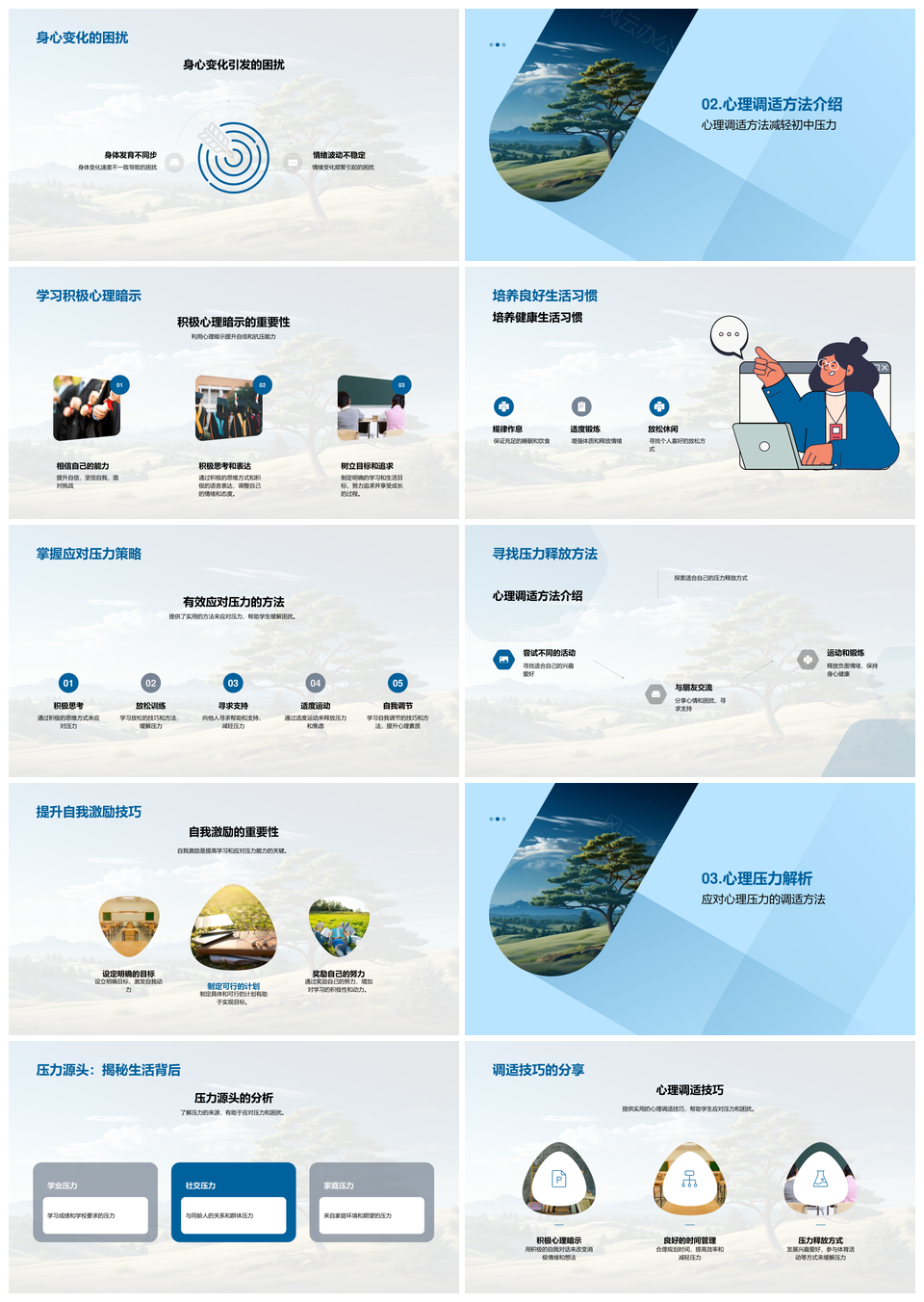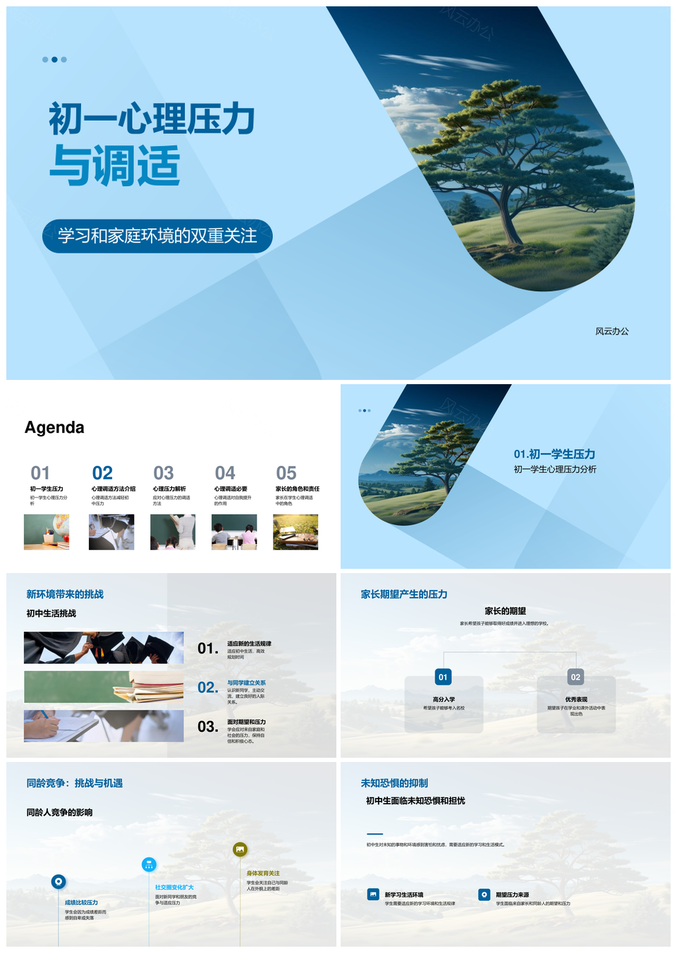风云办公提供的初一心理压力学习家庭调适指导活动PPT模板,下载格式为pptx,一共33页,作品中文字及图均可以修改和编辑,图片更改请在作品中右键图片并更换,文字修改请直接点击文字进行修改。